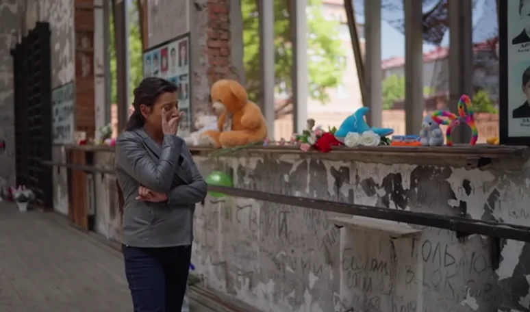 Сама же Маргарита скорбно бредет по разрушенному спортзалу, превращенному в мемориал, рассматривает фотографии погибших детей и содрогается от рыданий. В какой-то момент она, словно подкошенная, падает на колени перед большим крестом, установленным здесь же (и заодно перед собственным мужем Тиграном Кеосаяном, почему-то стоящим за крестом), воздевает очи к небу и признается в невольном кощунстве: тогда, 20 лет назад, у нее первый раз появились вопросы к Господу. За что вот это этим людям? Как это оказалось возможно? Господь, как и власть, не дает ответа. Маргарита не теряет надежды все же получить ответ. От Господа, разумеется. К власти какие вопросы?