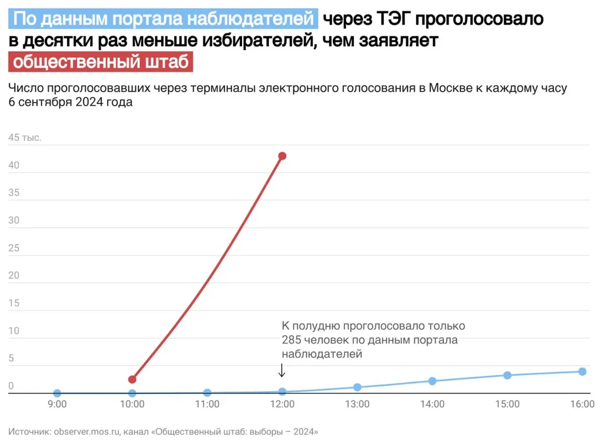 Общественный штаб сообщил, что через терминалы электронного голосования (ТЭГ), расположенные на участках в Москве, проголосовало более 43 тысяч избирателей.