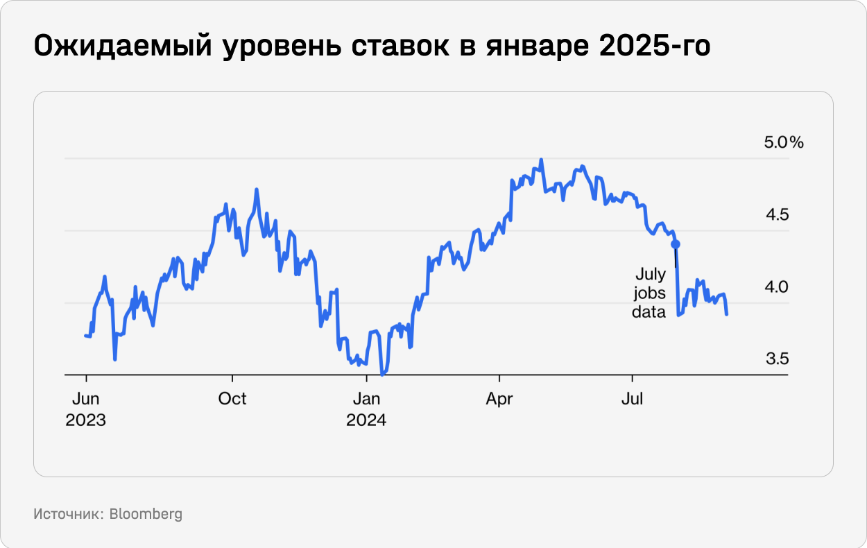 Последний раунд снижения ставок произошел в среду после того, как число вакансий в США в июле упало до самого низкого уровня с начала 2021 года. Более слабые, чем ожидалось, данные по рынку труда подкрепили уверенность рынков в более резком снижении ставок ФРС в сентябре. Сейчас инвесторы ждут, что в январе ставки окажутся ниже 4%, также выросла вероятность того, что в сентябре ФРС снизит ставки сразу на 50 б. п. (в пятницу до выхода данных по рынку труда она составляет 43%).