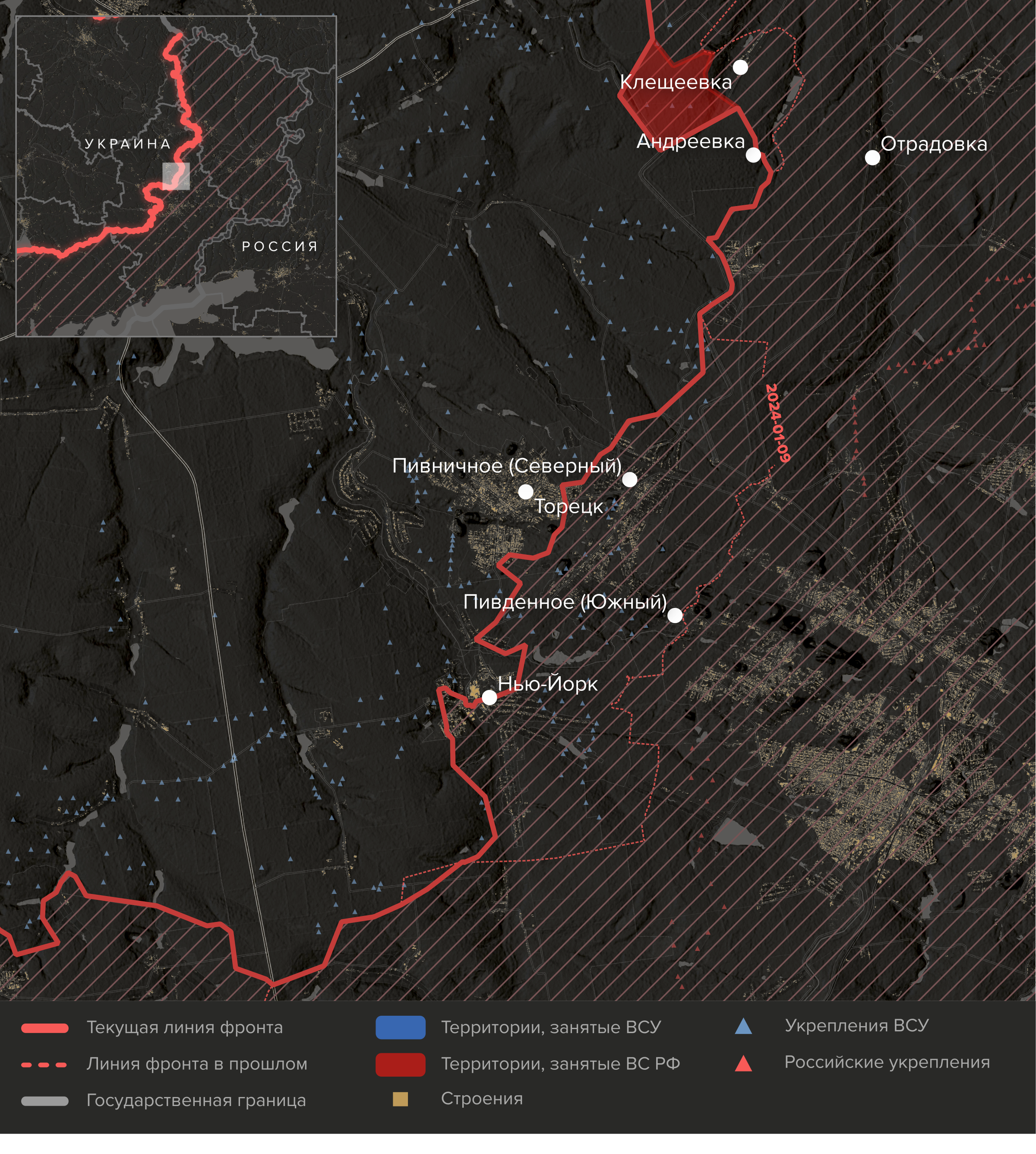 - С другой стороны, российские войска начали атаки в направлении Торецка с востока — из сел Клещеевка, Андреевка и Озаряновка к югу от Бахмута.