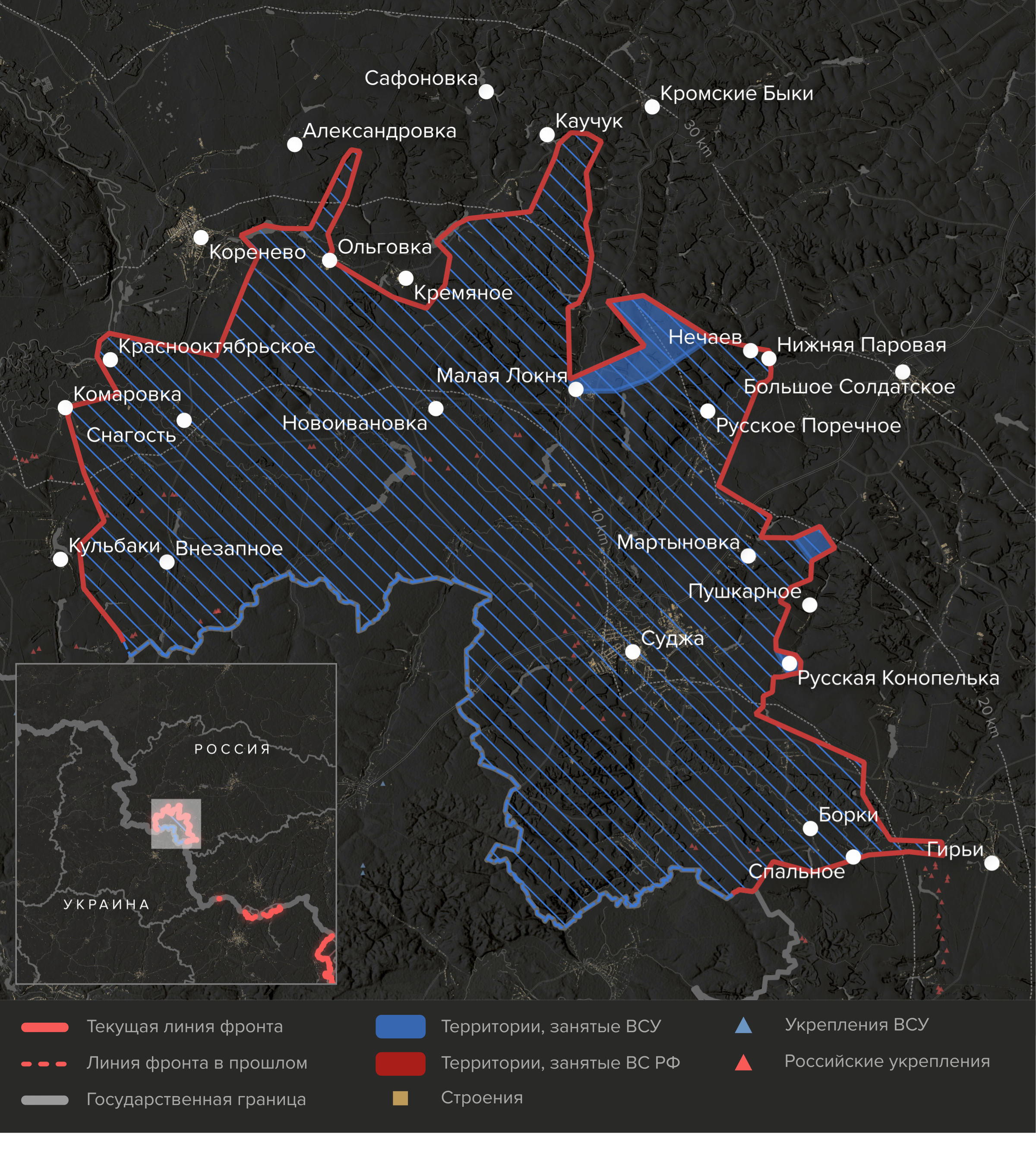 - Украинские войска после нескольких недель боев захватили Малую Локню на дороге Суджа — Льгов и продвинулись на несколько километров на север. Но следующий заслон ВС РФ в Кромских Быках пока кажется надежным.