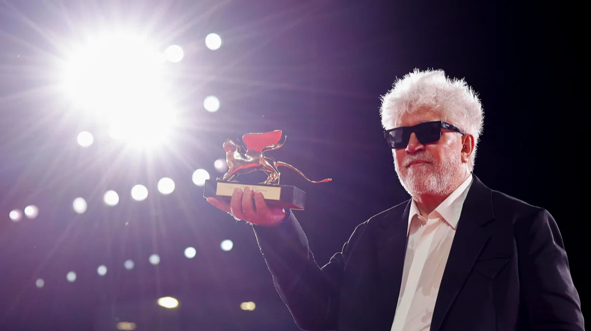 Испанский режиссер и сценарист Педро Альмодовар держит награду «Золотой лев» за фильм «Комната по соседству» на церемонии закрытия 81-го Венецианского международного кинофестиваля, Италия, 7 сентября 2024 года. Фото: Fabio Frustaci / EPA-EFE