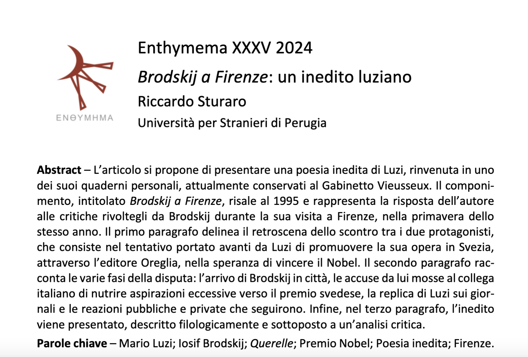 В нынешней статье Риккардо Стураро объясняет всю, скажем так, закулису. На самом деле Бродский правильно почувствовал, что Луци уже давно стремился к Нобелевской премии и разрабатывал эту цель. Сама история Луци и его отношений со Стокгольмом, с Нобелевским комитетом началась примерно за 30 лет до визита Бродского во Флоренцию. Это долгая и сложная история, которую Риккардо Стураро в подробностях раскрыл.