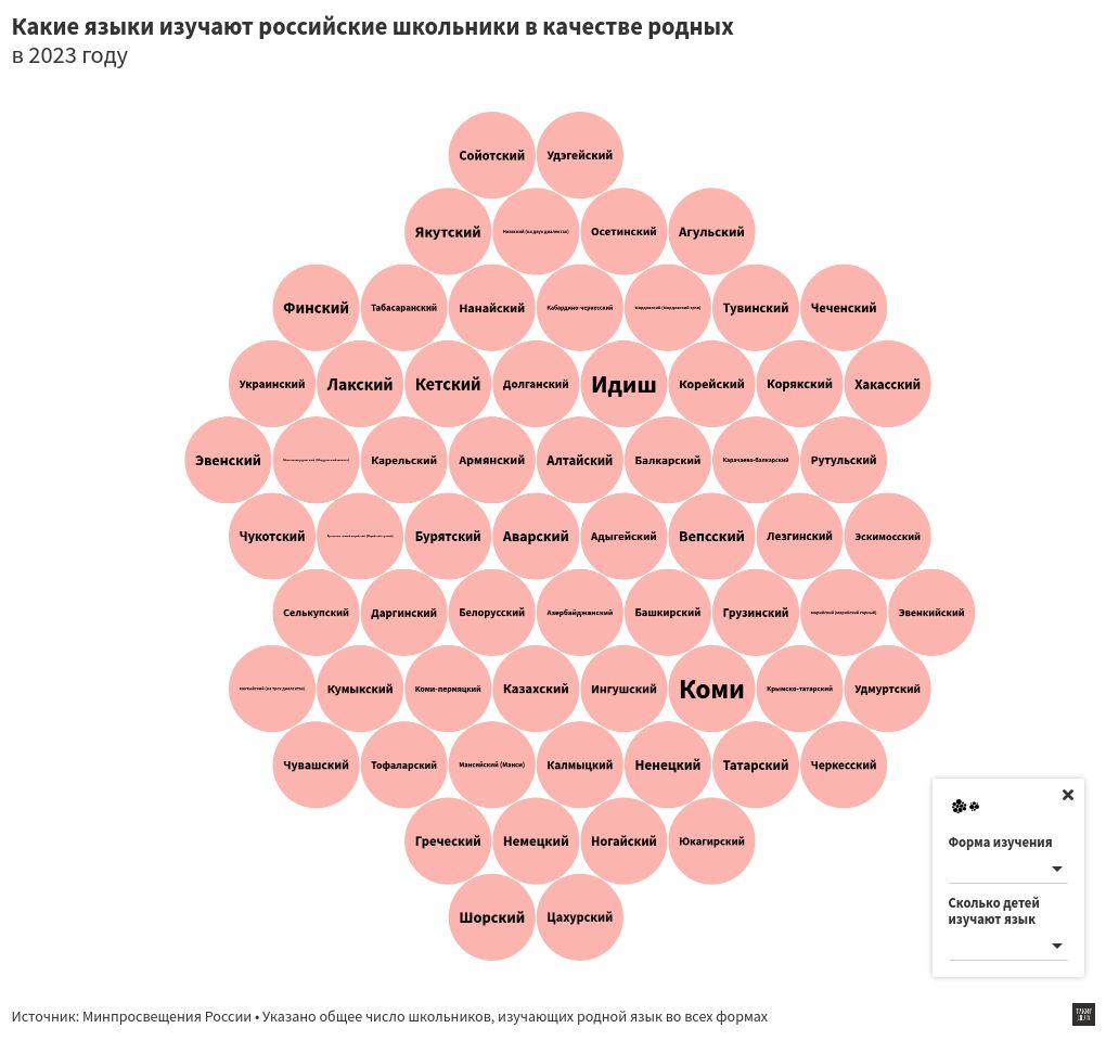 За это же время полностью прекратилось преподавание на 38 языках, в том числе на алтайском, бурятском и ингушском. В 2016 году в России были дети, которые изучали на них общеобразовательные предметы. К 2023 году таких школьников не осталось.