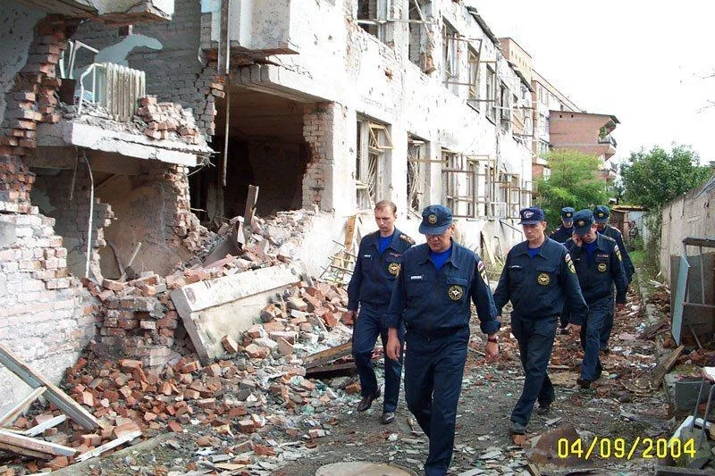 Разрушенный и выгоревший южный флигель бесланской школы и сотрудники МЧС. На переднем плане — Сергей Шойгу. 4 сентября 2004 года. Фото: Дмитрий Беляков