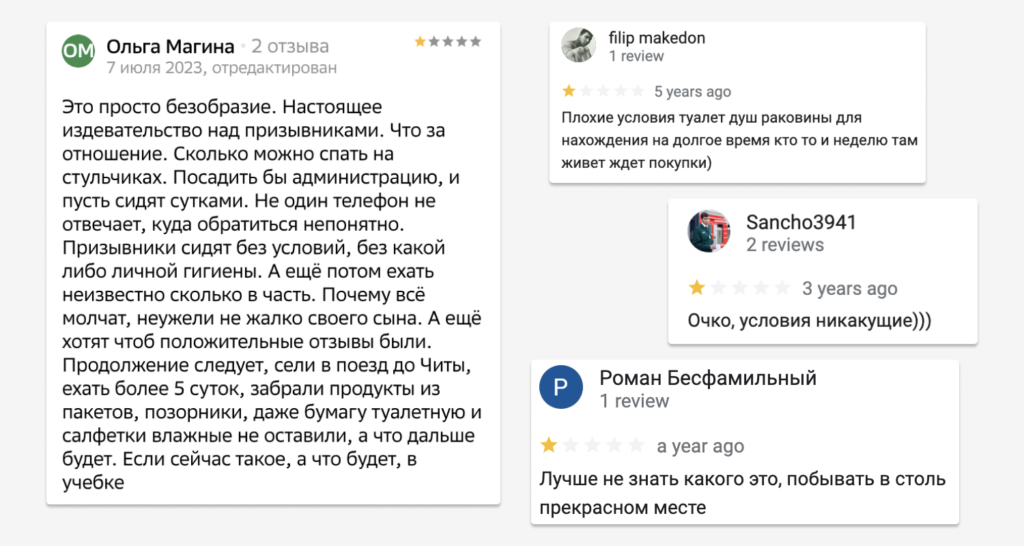 Мать одного из призывников Марина Атарес в июле 2023 года описывала, как ее сын провел в «Южном» четыре дня. По ее словам, в первый день призывники сидели в актовом зале с утра до девяти вечера: «Ели бадягу. В туалет лучше не ходить. Он на улице и засран. Периодически вызывают на комиссии», — писала она в отзывах на сайте 2ГИС.