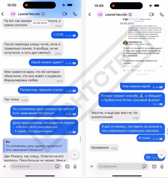 Нападение на жену экономиста Миронова. В первый день осени 2023 года в Аргентине неизвестный ударил на улице Александру Петрачкову, жену российского экономиста Максима Миронова, который участвовал в разработке президентской программы Навального в 2018 году. При этом он выкрикивал: «Держись подальше от России». В апреле стало известно о том, что полиция Польши задержала нападавшего, им оказался гражданин страны Гжегож Дашковский. СМИ видели за этим нападением след Кремля. Но, судя по переписке, его также организовал Невзлин.