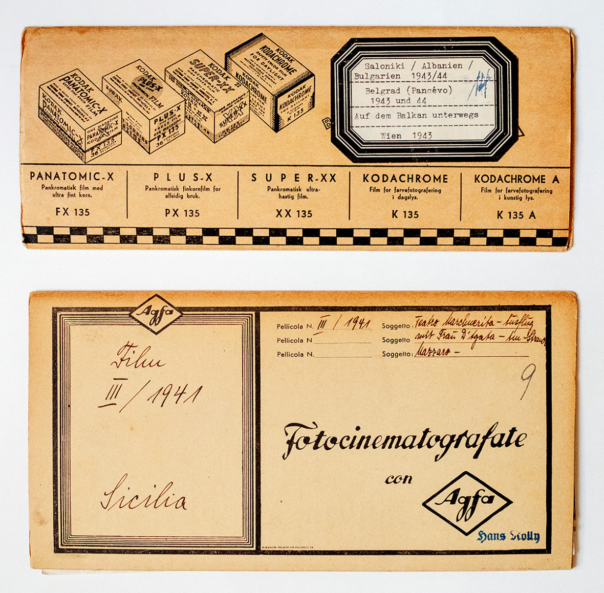 Специальные картонные конверты для фотопленки фирмы Kodak и Agfa. На конвертах короткие подписи от руки или напечатанные на печатной машинке и наклеенные на конверт. Кроме этого, конверты с именным штампом фотографа-любителя — Ганса Ролли (нем. Hans Rolly).