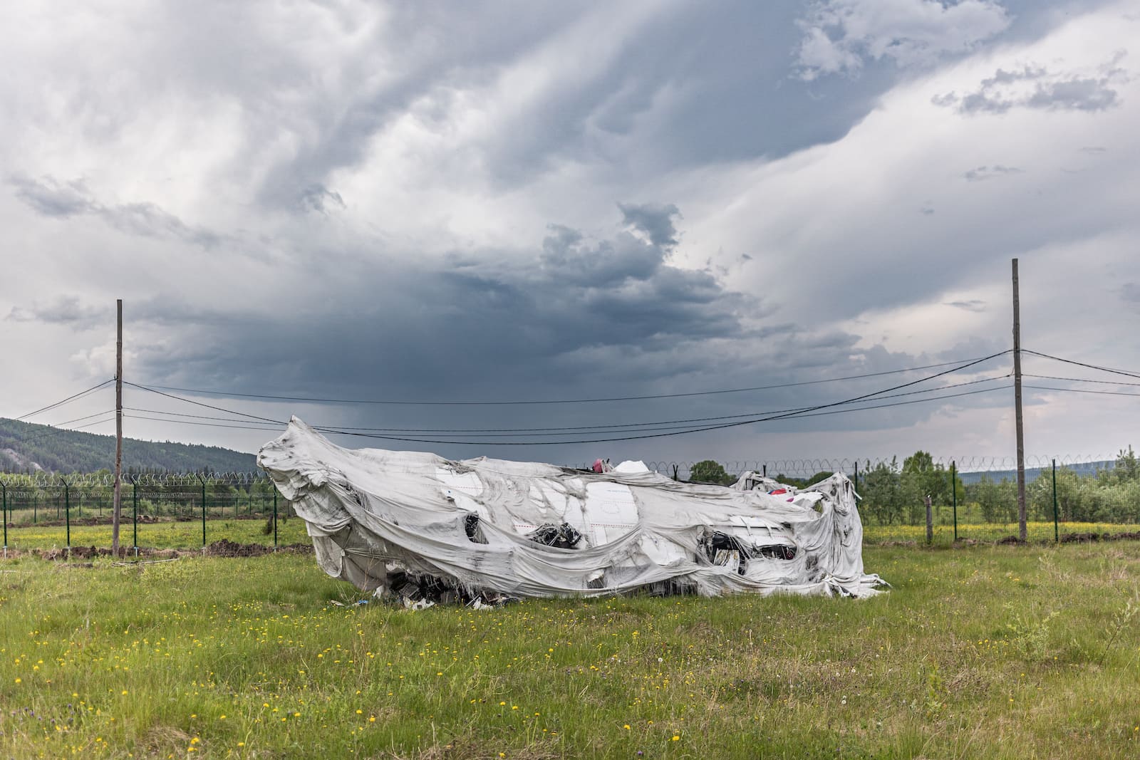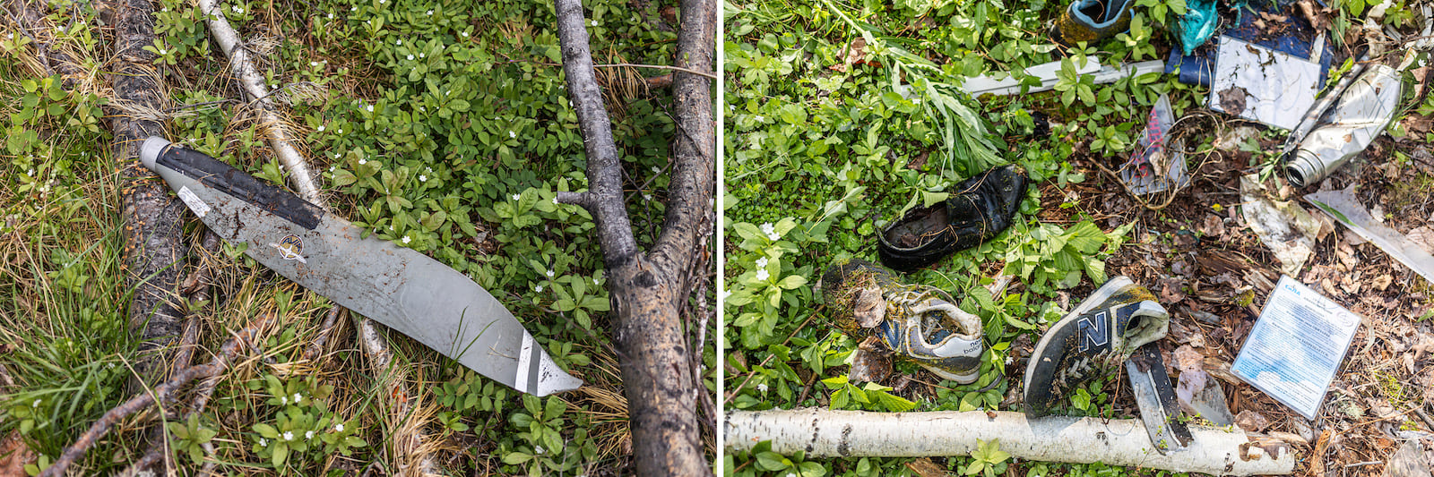 За три года поляна на противоположном от села Казачинского берегу реки Киренги могла зарасти лесом. Он бы скрыл все следы авиакатастрофы: в сентябре 2021 года здесь разбился самолет L-410. Но люди не убрали за собой. Среди сломанных деревьев до сих пор лежат куски винта, дерматиновые накидки на пассажирские кресла, кислородные маски, инструкции по безопасности авиакомпании "Сила" и вещи пассажиров – смятый термос с гербом России, кроссовки и мужские туфли.
