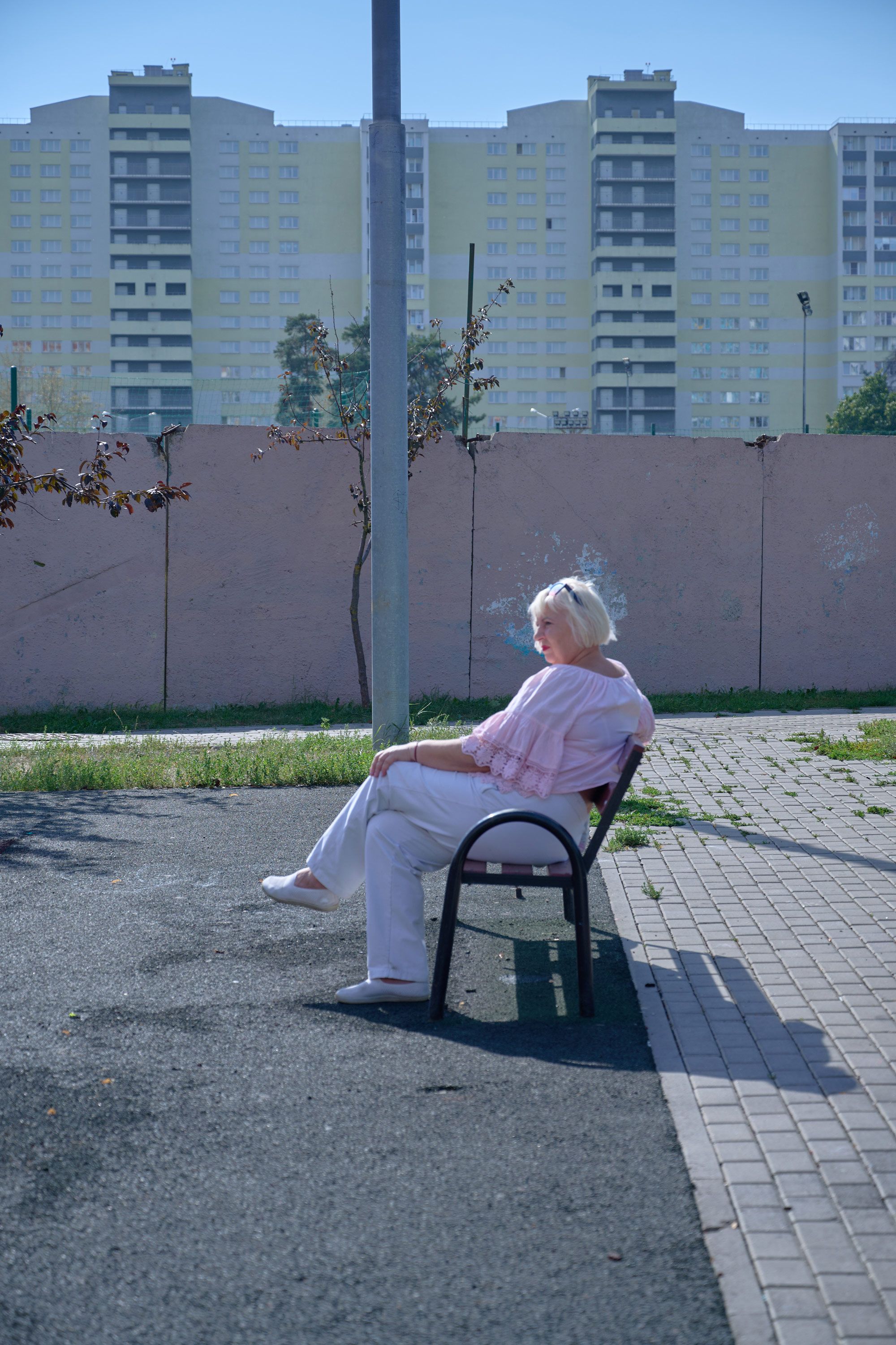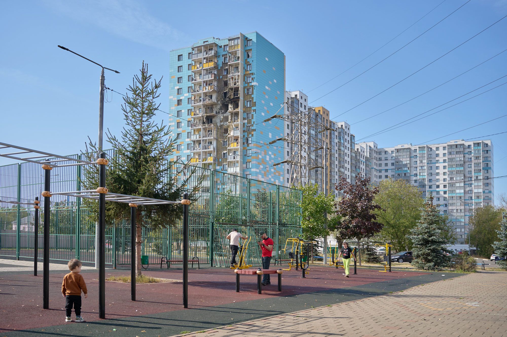 A elderly man stands shirtless on one of his building’s communal balconies, smoking a cigarette as he looks into the distance. Across the street stands a pale blue building that’s been badly damaged by a drone explosion: there are gaping holes where windows used to be, the balcony frames are partially melted, and the facade is crumbling. The mutilated structure is impossible to miss, but the man seems to deliberately cast his gaze elsewhere.
