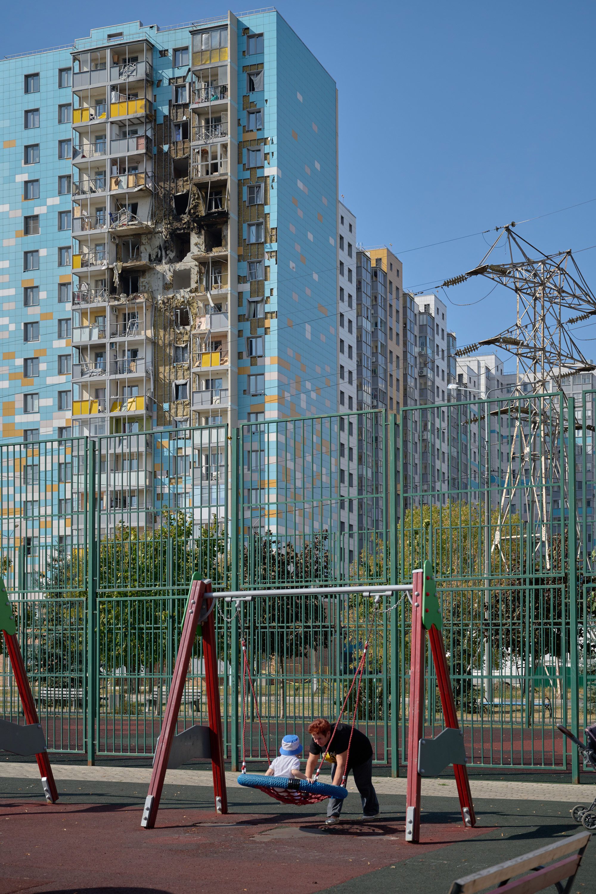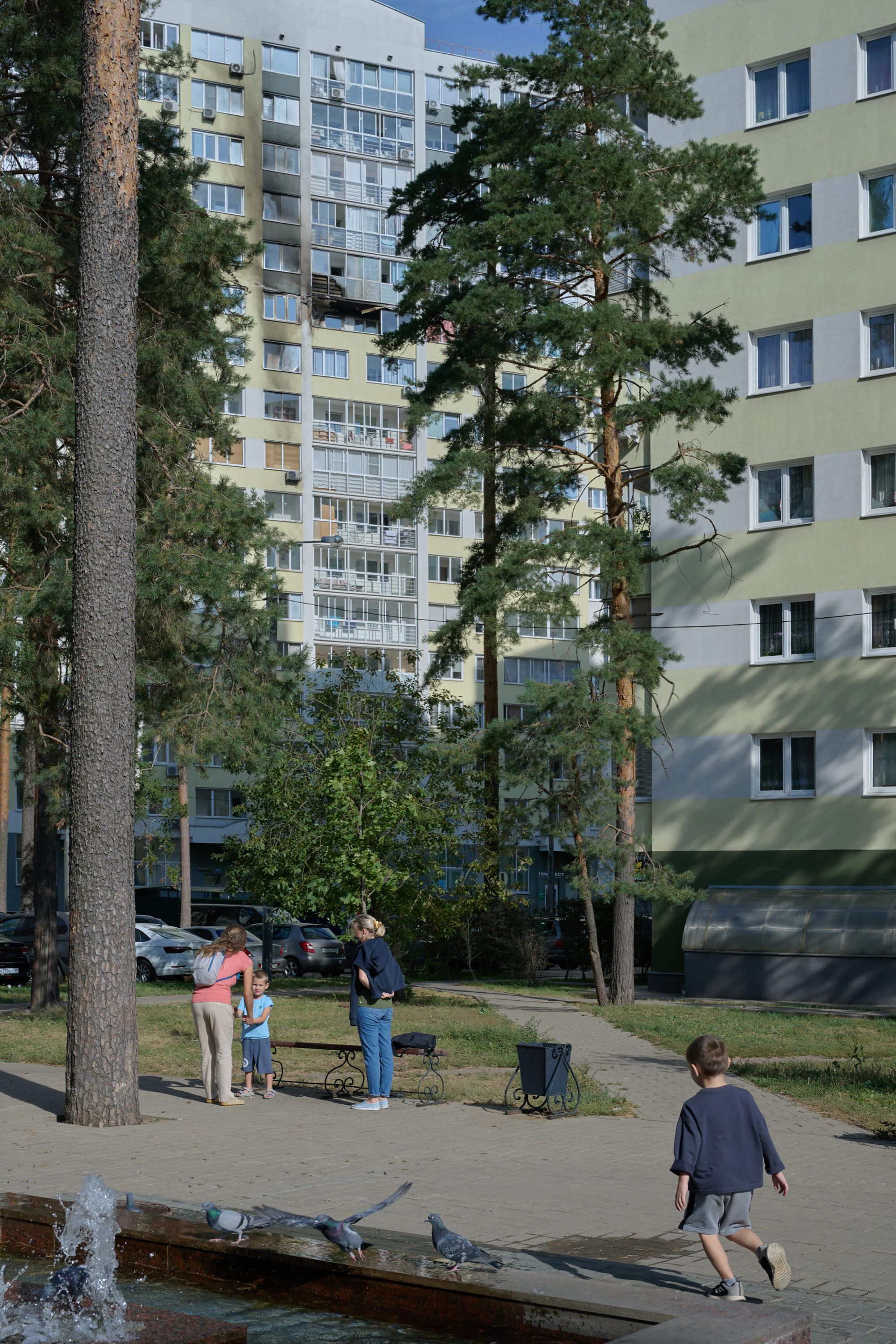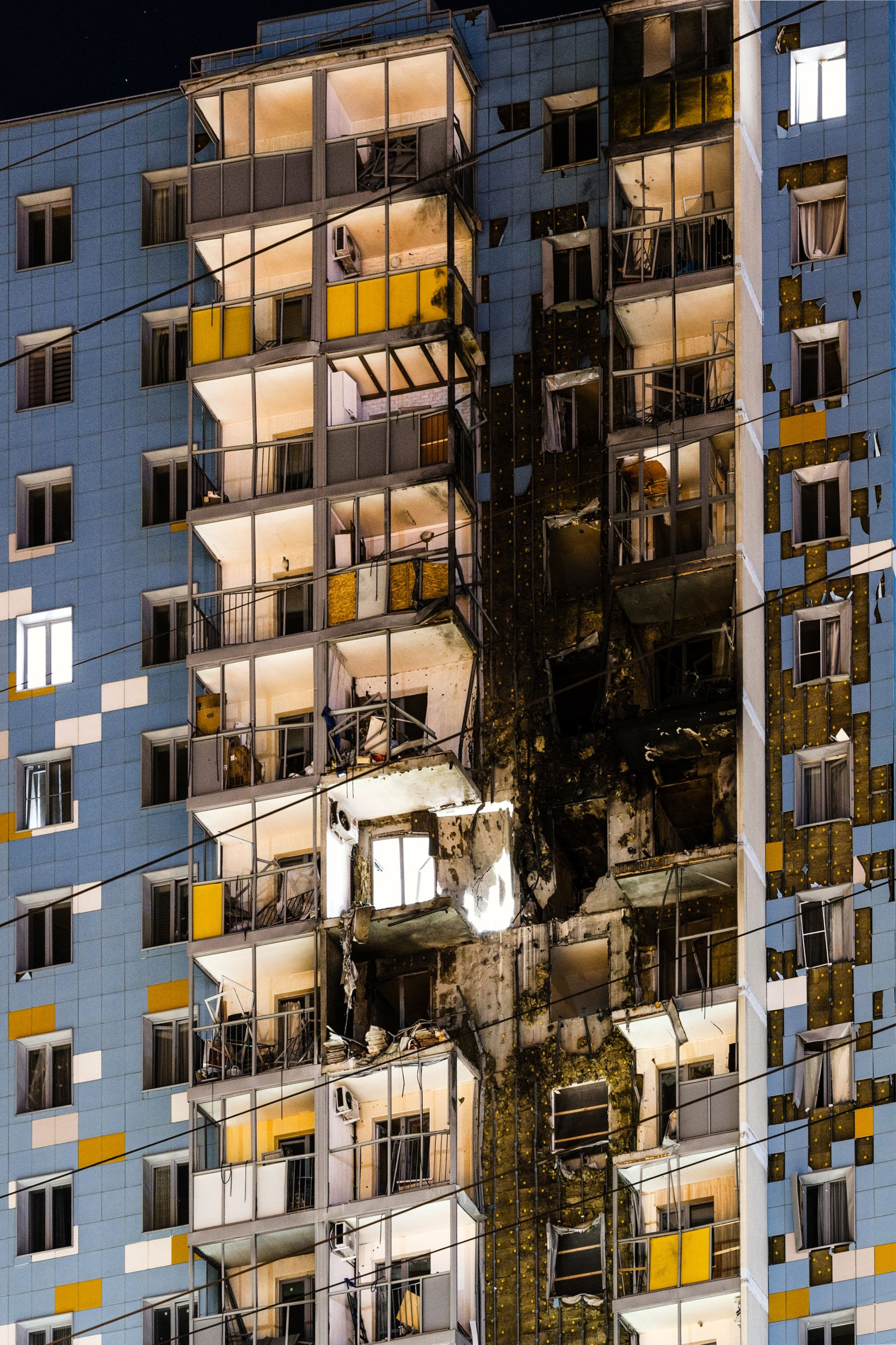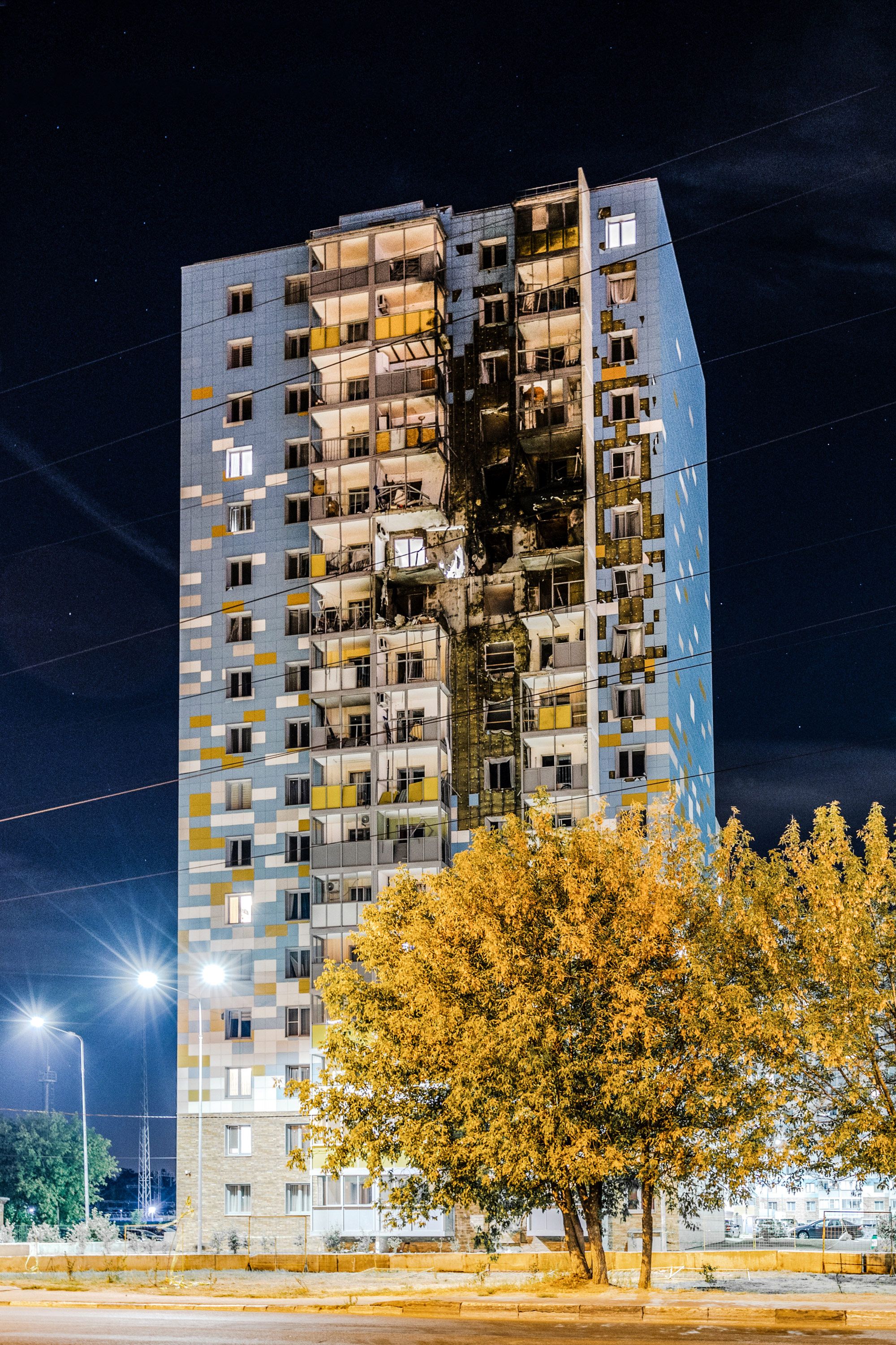“Those poor people need help: a lot of them have outstanding mortgages,” says Ekaterina, gesturing towards the lit-up windows. She’s still paying off an apartment in the building herself, and she fears the damage from the drone attack might not be covered by insurance, leaving her neighbors paying off loans for burnt-out units. Her own apartment wasn’t damaged, but she finds this cold comfort: “We had such a beautiful building and now the children will have to look at this.”