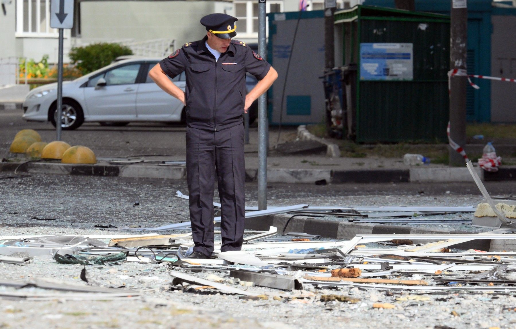 Most of the photos circulating on social media showed the blue building, which received the most damage. But two other buildings in town were struck that night as well. At one of them, a 17-story building, the police cordon has already been removed and the surrounding area cleared of debris. The second building still has protective barriers in place, and two rescuers in protective suits and helmets are clearing debris from the damaged apartments. As you walk through the courtyard, charred fragments crunch underfoot along with small pieces of concrete, glass, and plastic.