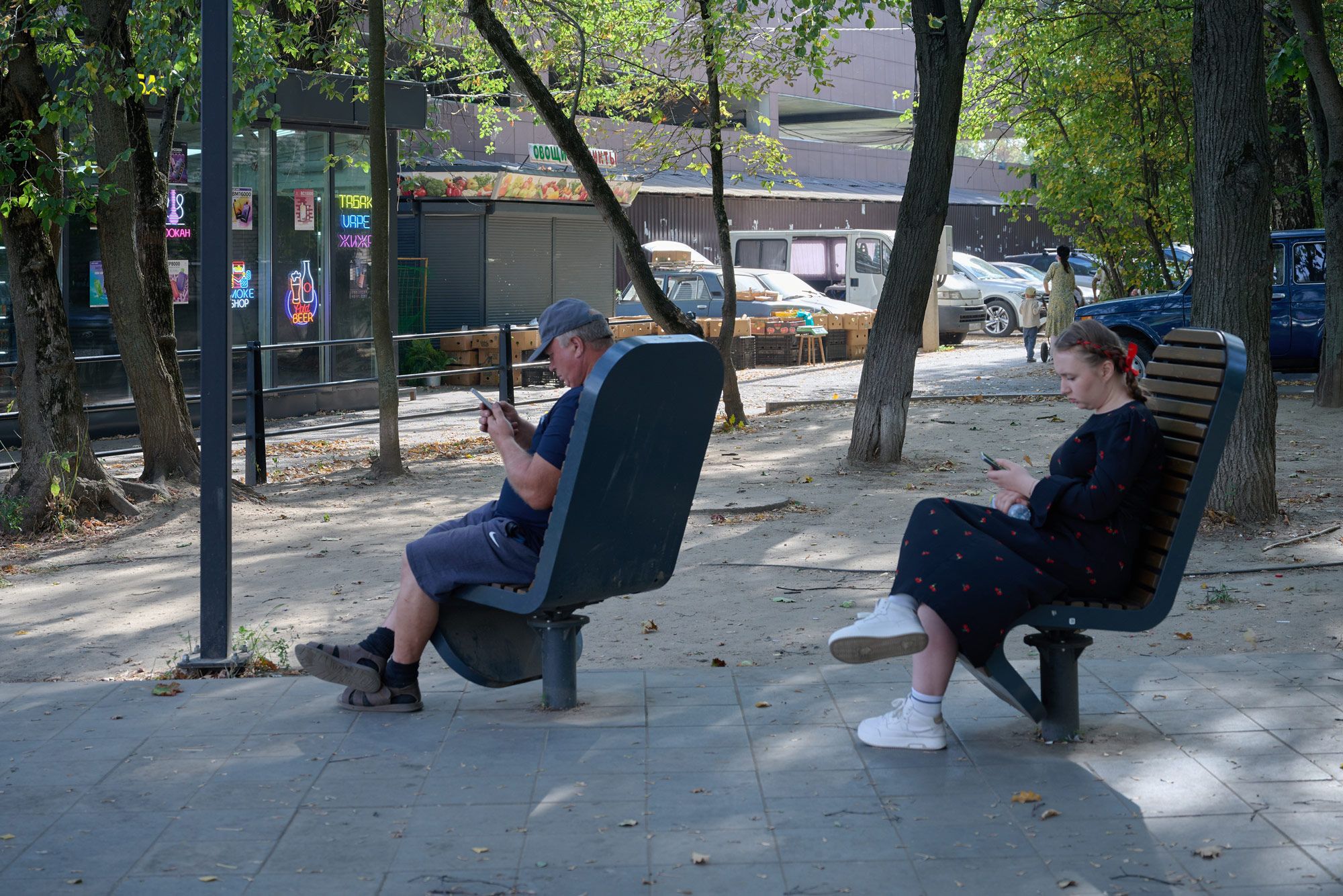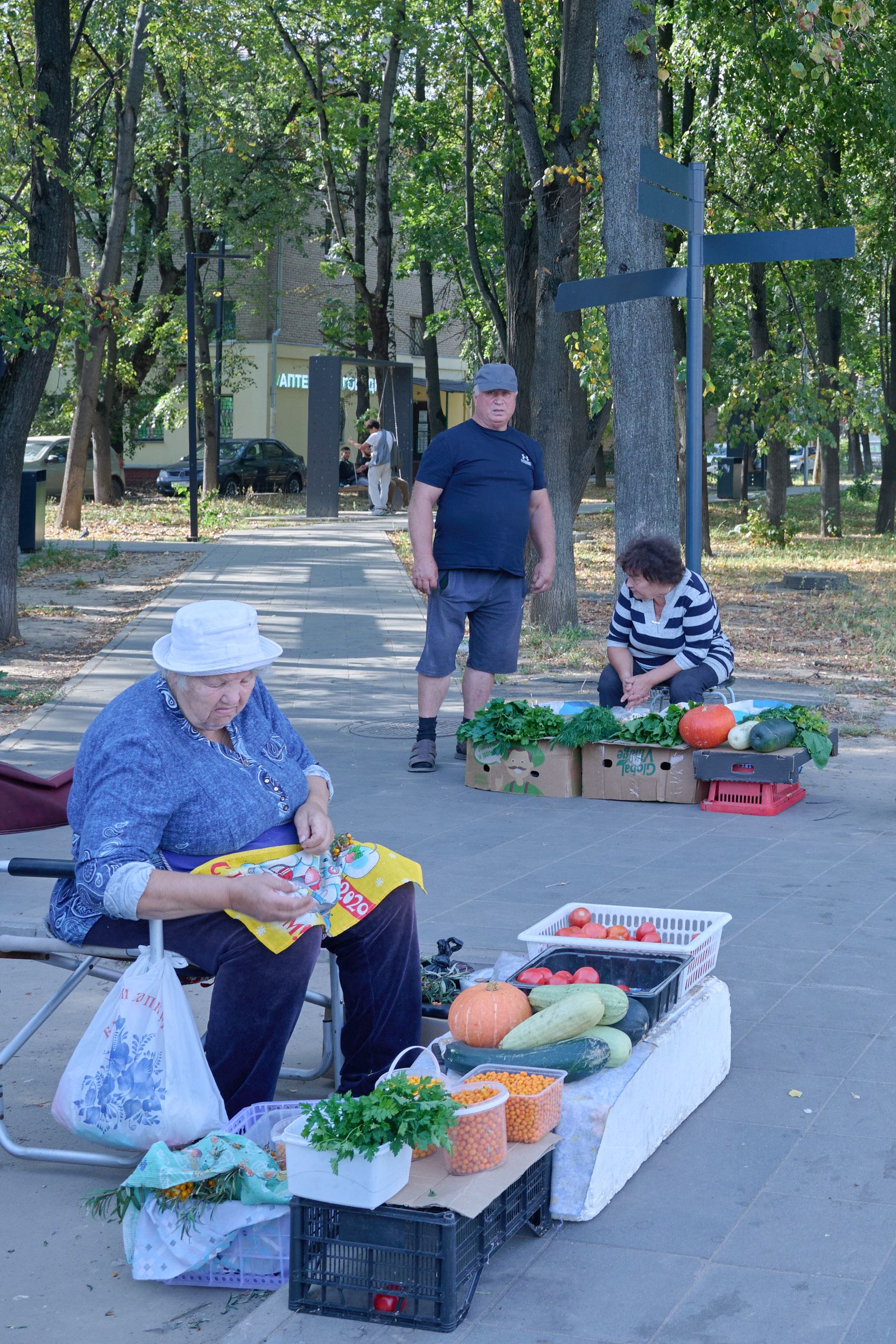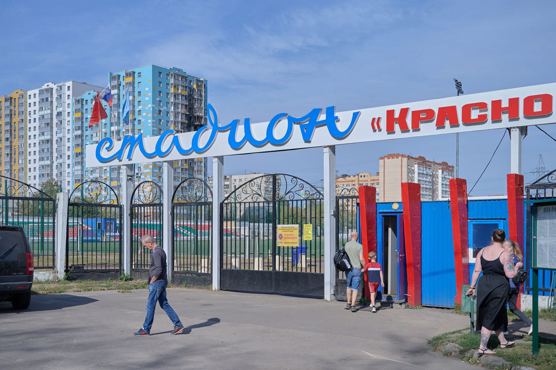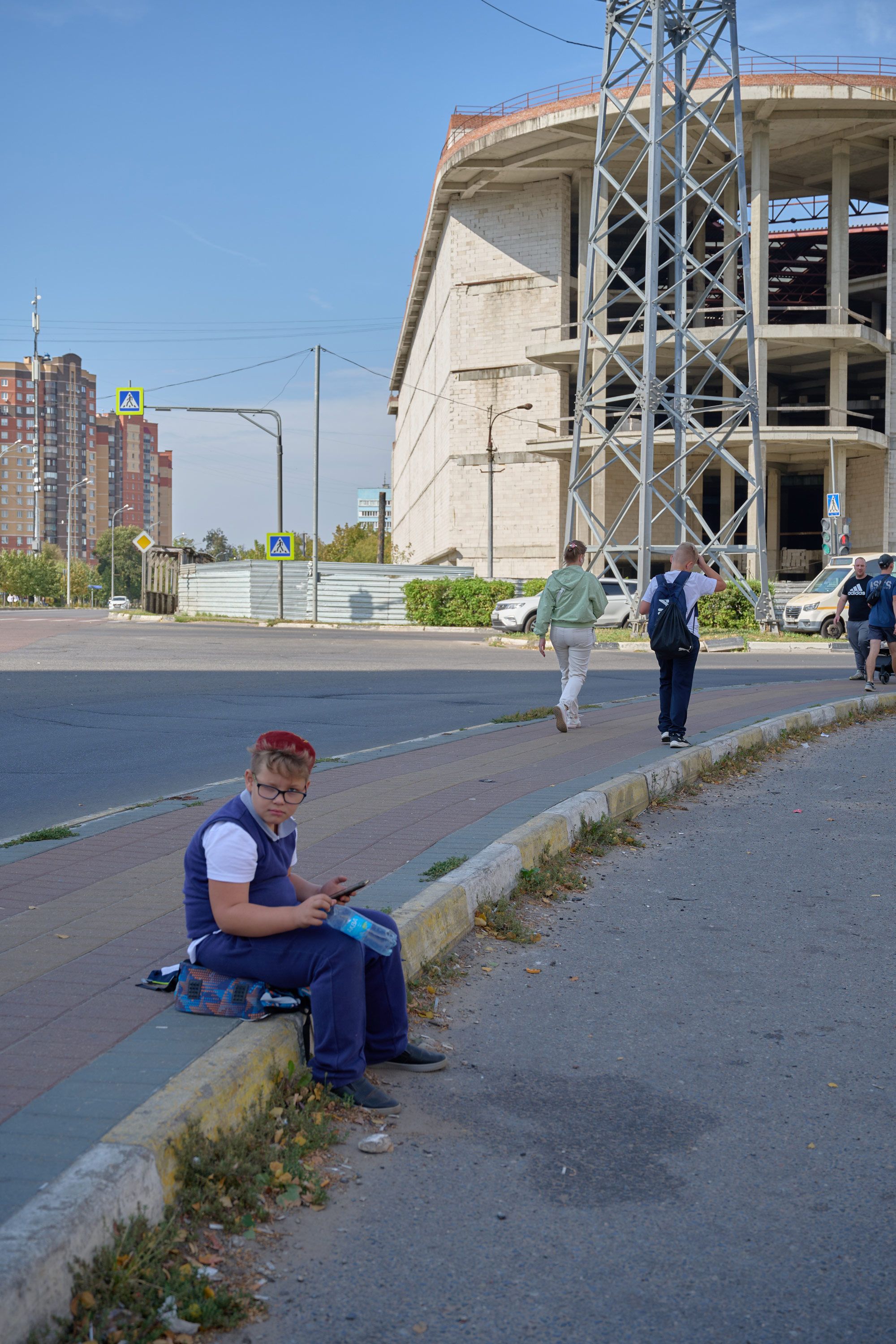 In the vicinity of the disfigured apartment complex, which was hit by a Ukrainian drone on September 10, is a railway station, a market, a community center, a stadium, and several schools — in other words, the area is almost always bustling with people. Today, just a few days after the attack, is no exception: pensioners sell produce out of boxes on the street, teenagers zoom around on electric scooters, and mothers run errands with their children in strollers. As soon as you enter the courtyard of the blue apartment building, however, the atmosphere seems to shift.