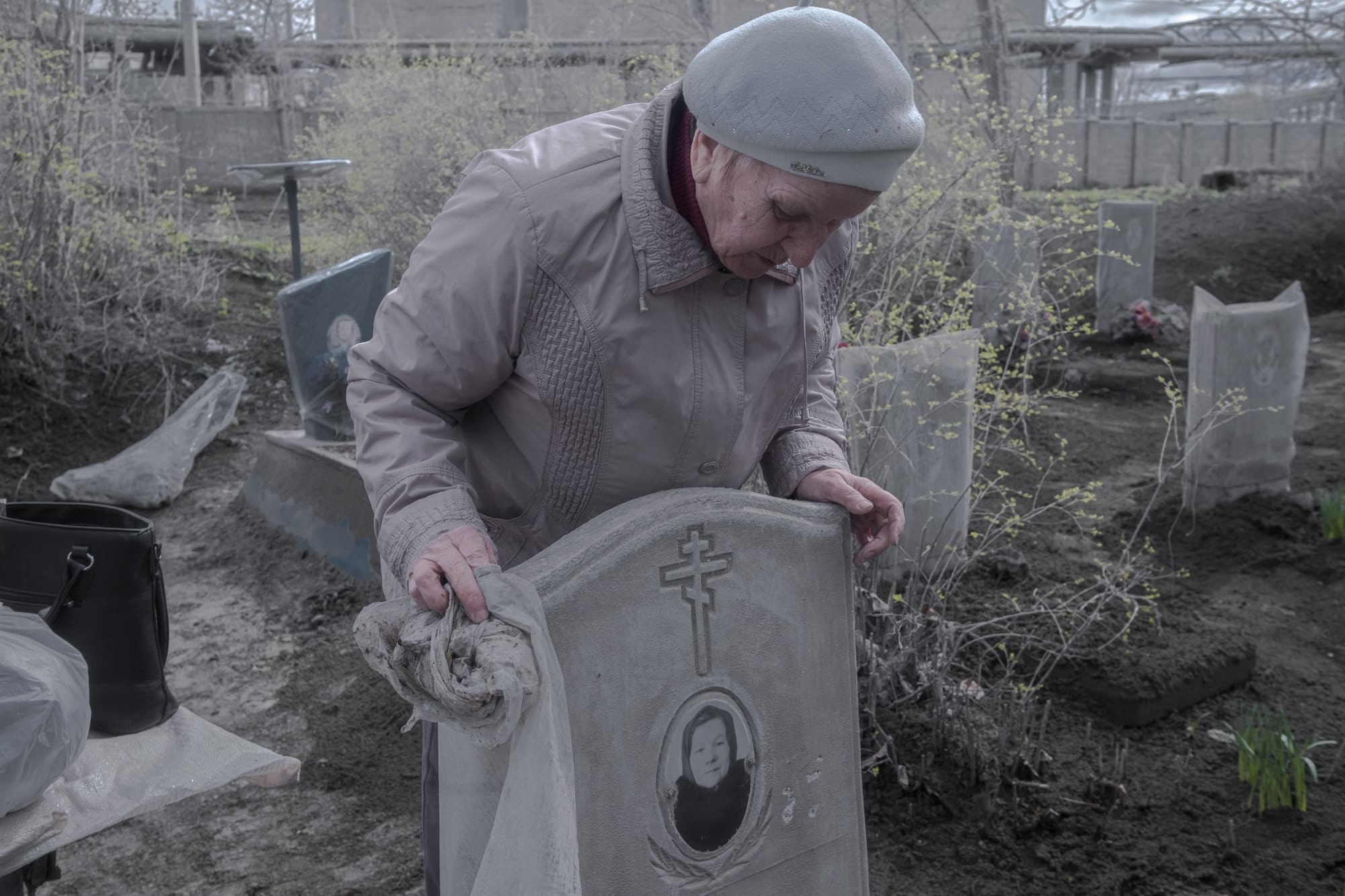 Памятники на могилах ее родни накрыты прозрачными полиэтиленовыми пакетами. Любовь Николаевна снимает один с надгробия своего племянника, но и под ним скопилась цементная пыль.