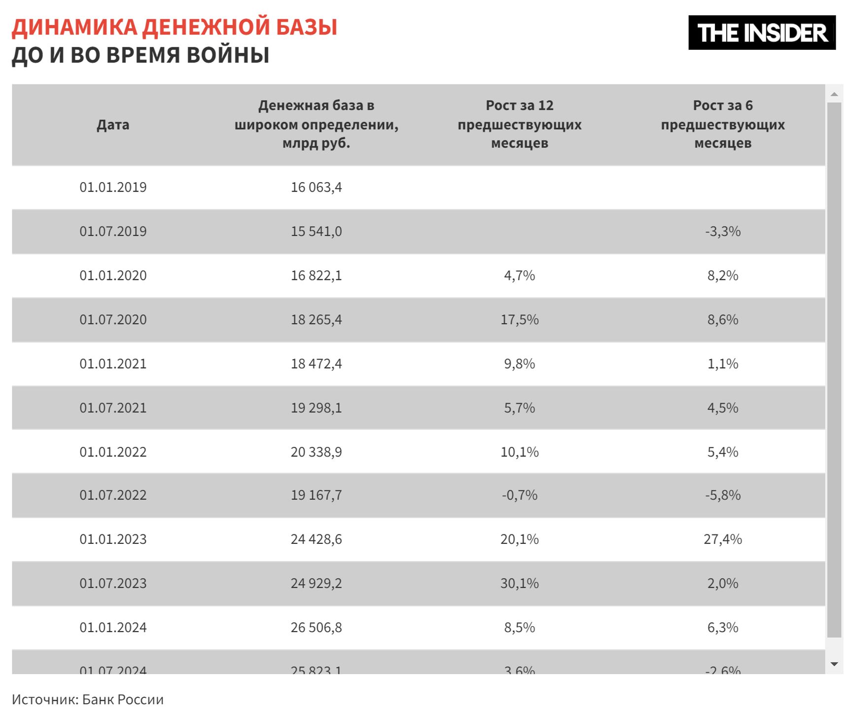 Количество наличных денег и средств коммерческих банков на счетах — это показатель, полностью подконтрольный ЦБ. Если ставится цель иметь инфляцию не выше 4% процентов в год, то логично и денежную базу каждый год увеличивать не более чем на 4%. Однако ведомство Набиуллиной нарастило денежную базу в 2019 году на 4,7%, в 2020-м — на 9,8%, в 2021-м — на 10,1%, в 2022-м — на 20,1% и в 2023-м — на 8,5%. А если смотреть по полугодиям, то видно много резких рывков: в первой половине 2022 года денежную базу сократили на 6%, а во второй — увеличили сразу на 27%. Потом в первой половине 2023-го нарастили лишь на 2%, а во второй — на 6% с лишним, и в 2024-м снова стали замораживать.