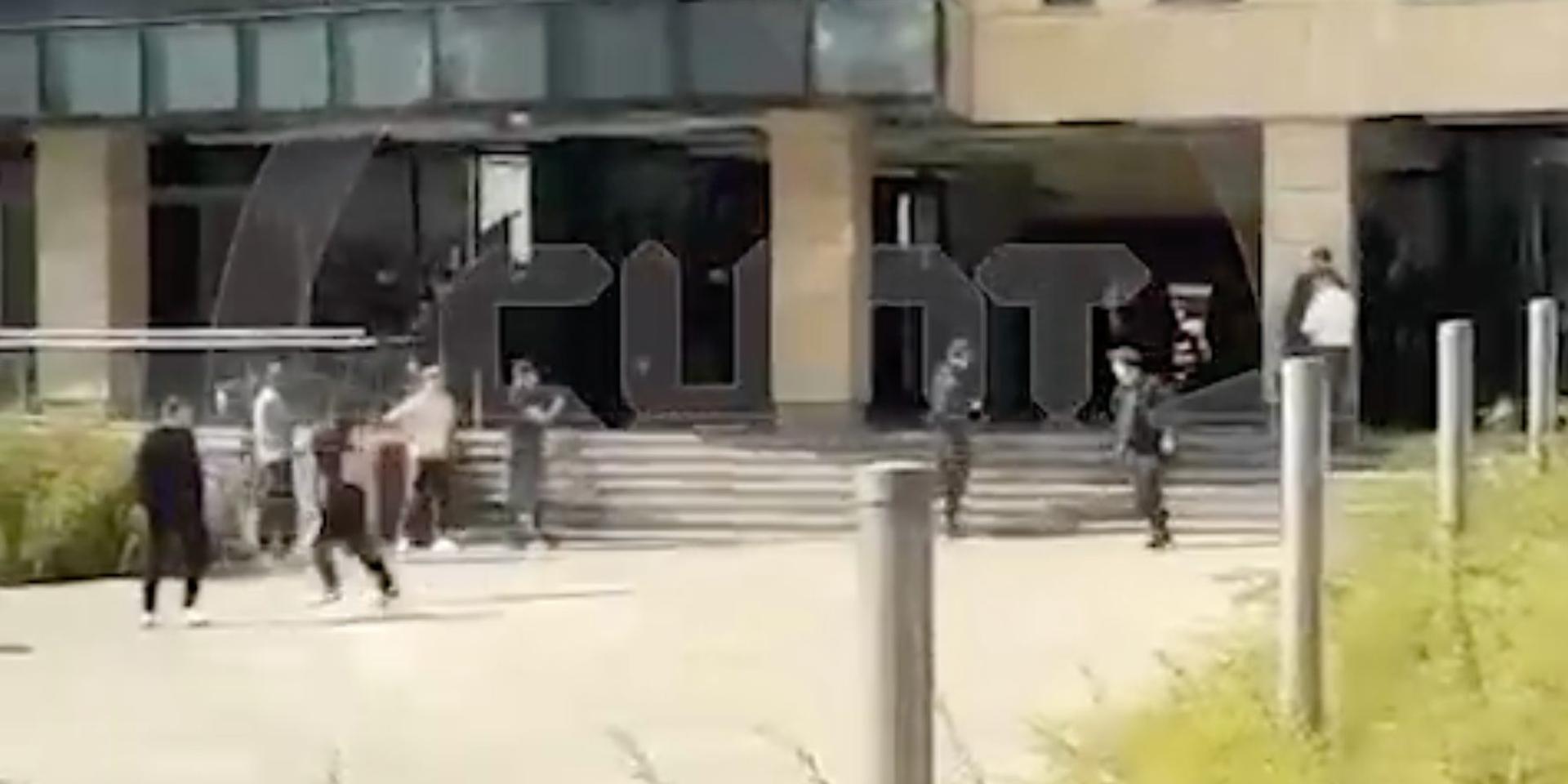 In the video, screams can be heard from inside the office building, with company employees hiding under desks.