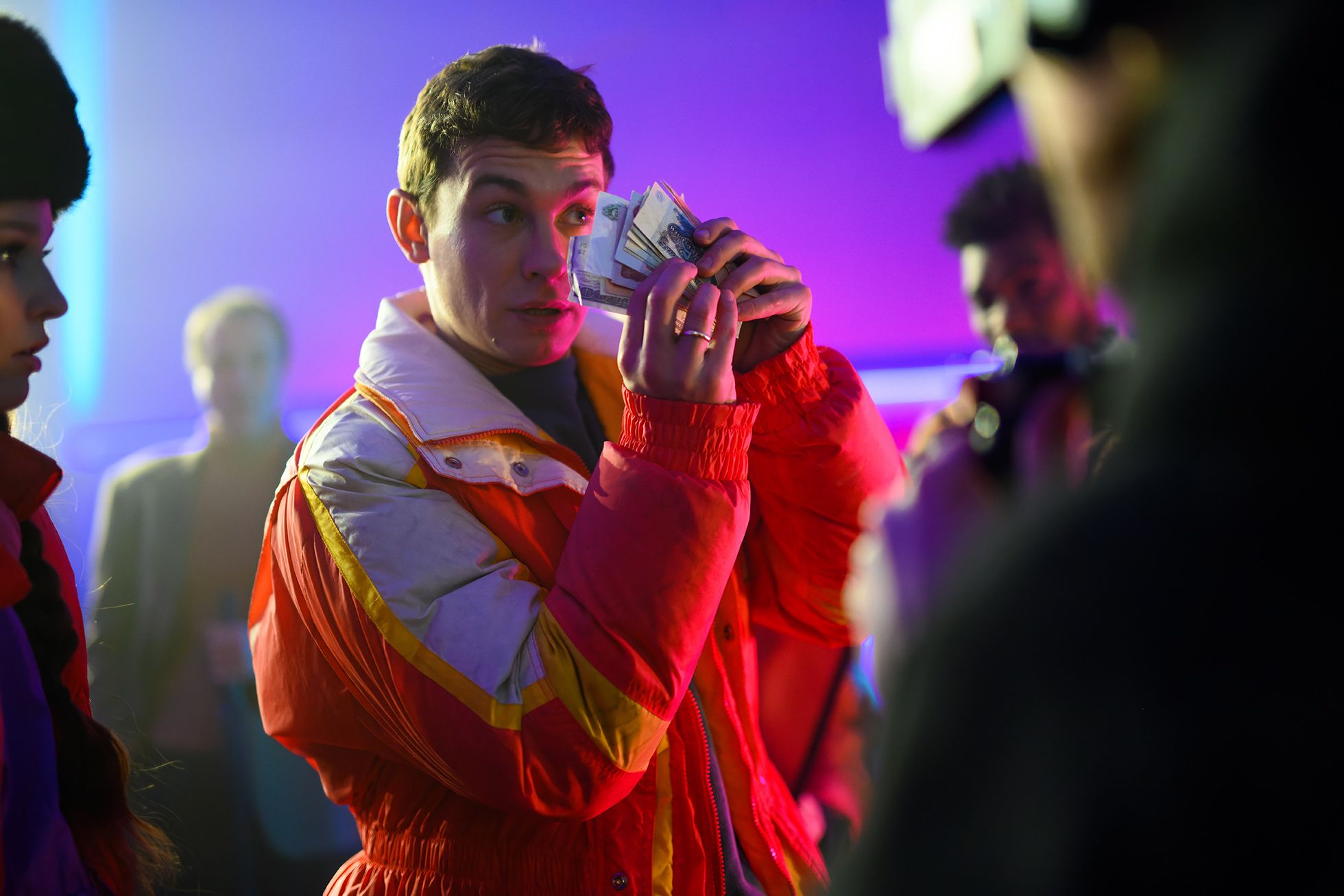 Вот герой Кологривого находит деньги, прошедшие мимо билетной кассы, — и почему-то снимает все это на видеокамеру, редкий гаджет по тем временам (что это, если не неумелая адаптация сюжета для зумеров?). Вот тот же герой, теперь уже смущенный, исповедуется перед Бари Алибасовым (его сыграл Аскар Ильясов, звезда сериала «Нулевой пациент»), рассказывая о своей заветной мечте — стать продюсером. Следом герой Кологривого уже сам бойко спекулирует билетами. А потом, виноватый, убеждает жену, что продюсерство — его истинное призвание. Наконец, еще в одной сцене Кологривый будто играет подвыпившего родственника на семейных посиделках — приобняв Виталия Окорокова (Владимир Канухин), его персонаж обещает композитору великое будущее.