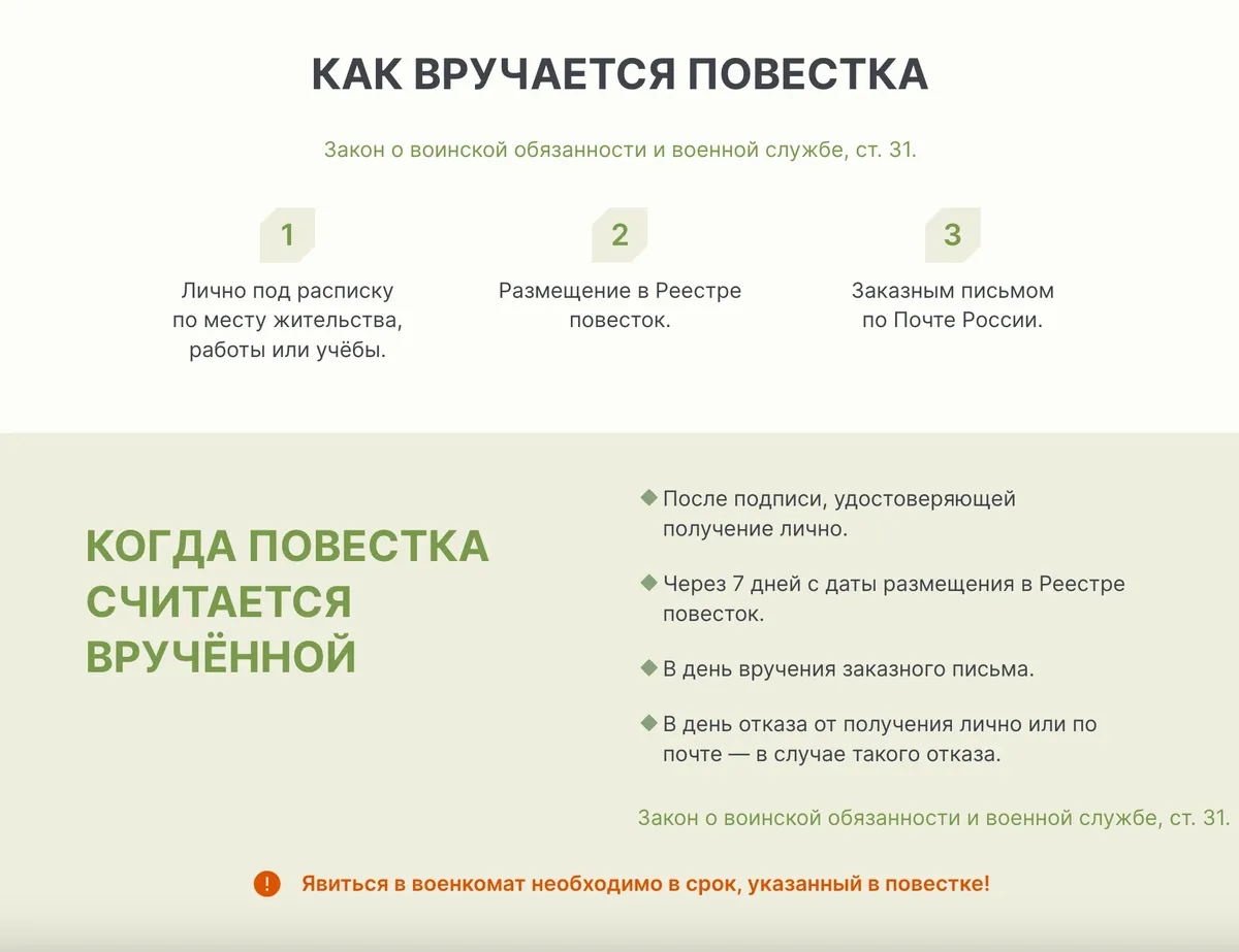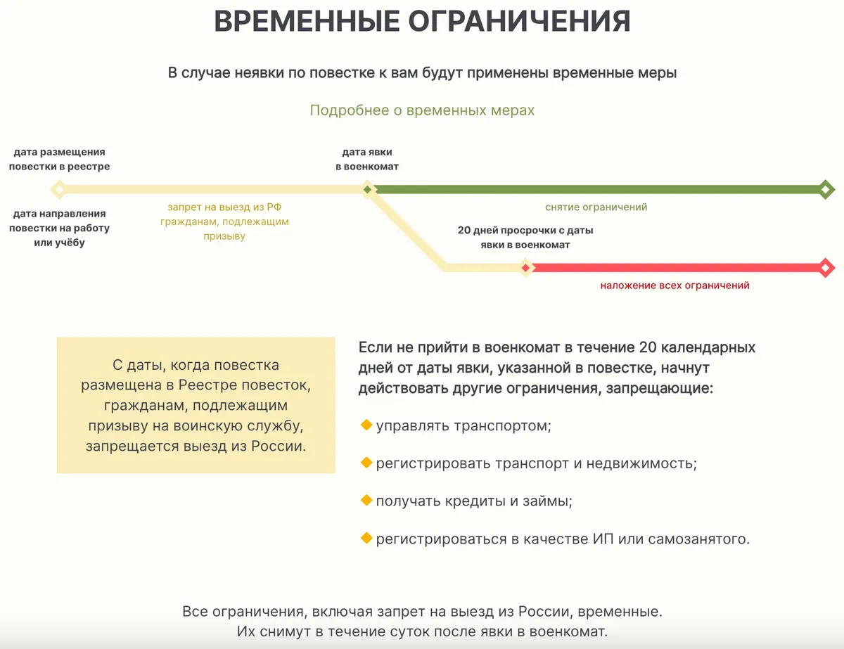 Согласно постановлению правительства, с 1 ноября в России полноценно заработает Единый реестр электронных повесток. Они будут считаться врученными по истечении семи дней после размещения в реестре. В отношении граждан, подлежащих призыву, введут ряд ограничений, включая запрет на выезд из России.