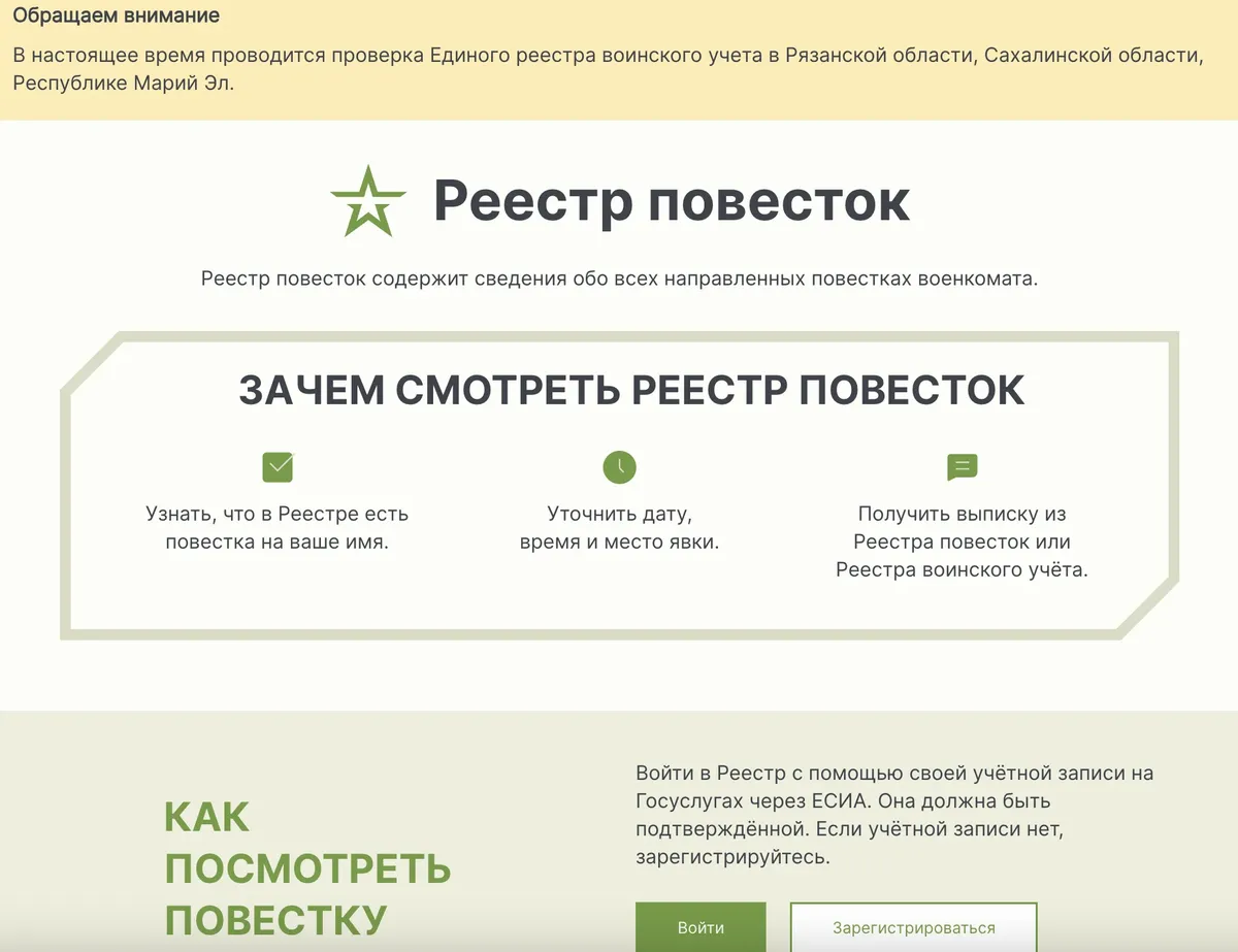В сообщении на сайте говорится, что «в настоящее время проводится проверка Единого реестра воинского учета в Рязанской области, Сахалинской области, Республике Марий Эл».