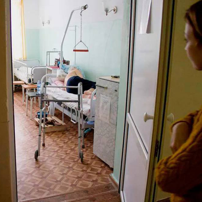 Внутри бетонные полы, примерно пять палат. Вокруг тишина, адский запах какой-то мертвечины, холодно очень, на кроватях лежат пожилые люди и не шевелятся. В одной палате было окно с дырками в раме, которые заткнули одеялом — оно было уже мокрым от снега.