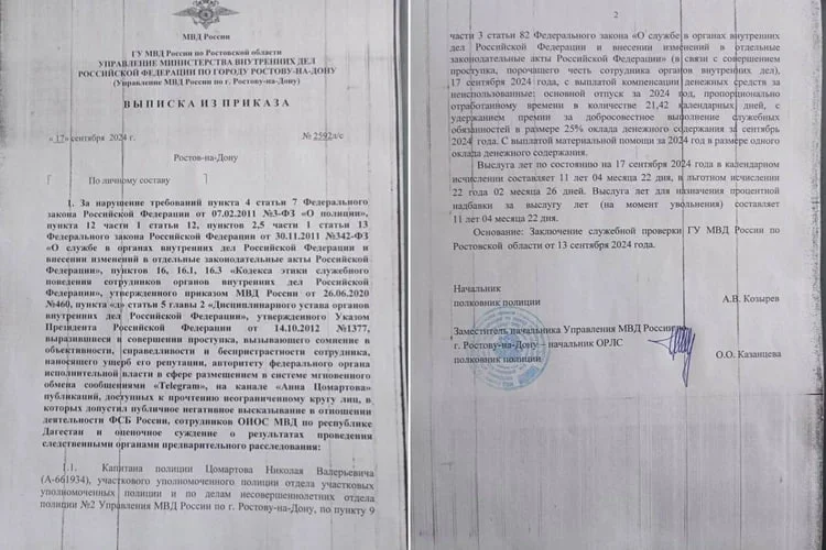 Капитана полиции из Ростовской области Николая Цомартова, чья дочь пропала на соревнованиях в феврале в Дагестане, уволили из МВД за критику в адрес следствия. Копию приказа об увольнении полицейский разместил в телеграм-канале по поиску дочери, вскоре публикация была удалена.