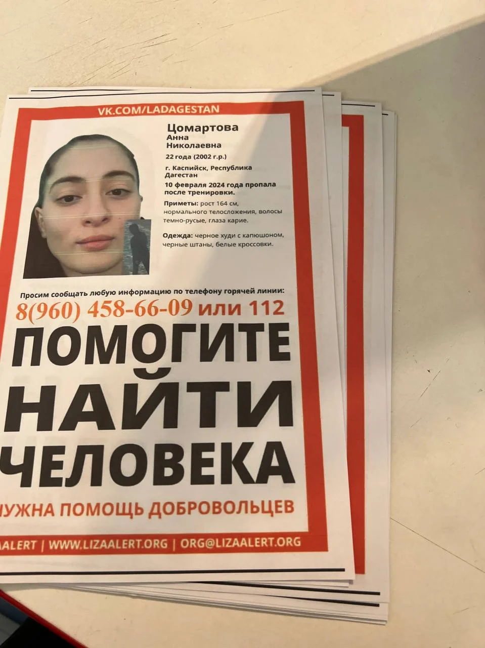 22-летняя дочь полицейского Анна Цомартова в феврале 2024 года поехала на соревнования по тайскому боксу в дагестанский Каспийск. 10 февраля девушка пропала. По словам очевидцев, в последний раз ее видели у набережной Каспийского моря недалеко от санатория ФСБ.