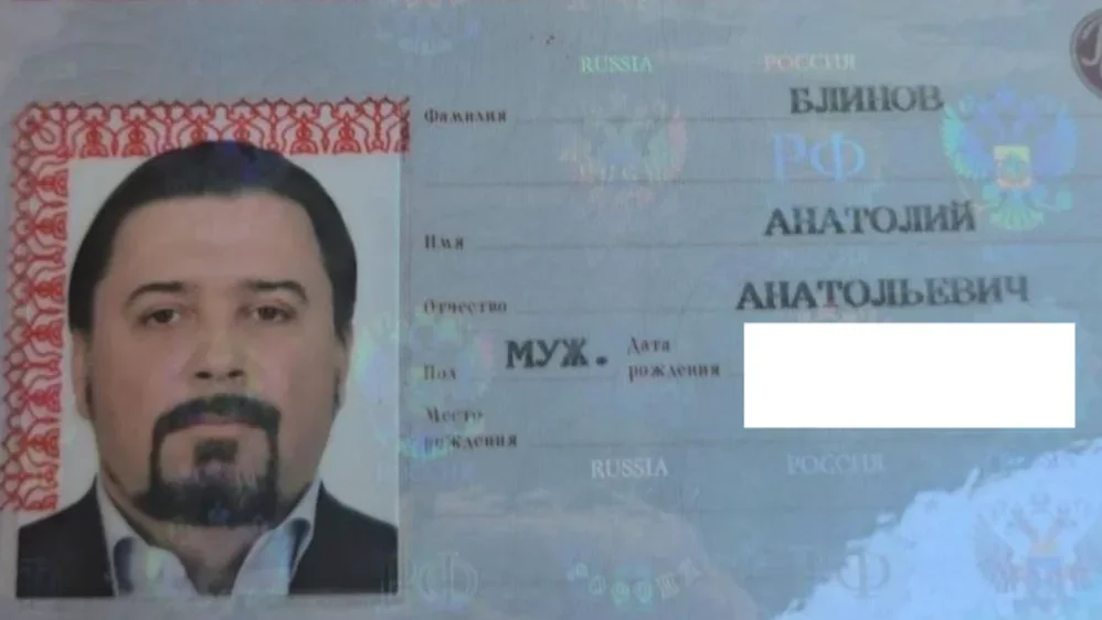 Anatoly Blinov’s partially redacted passport photo page. Photo: FBK