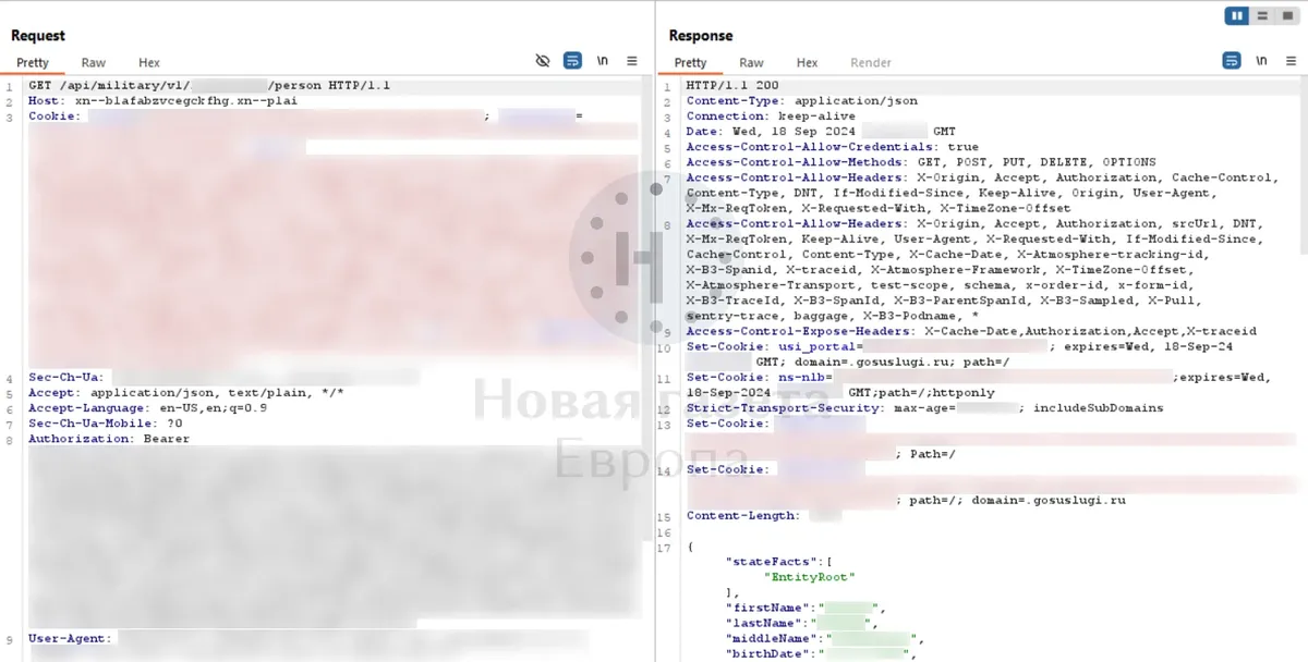 Ответ сайта на запрос о получении данных до исправления уязвимости (фото 1) и после исправления ошибки (фото 2). Для просмотра второго скришота листайте вправо. Скриншоты: «Новая газета Европа».