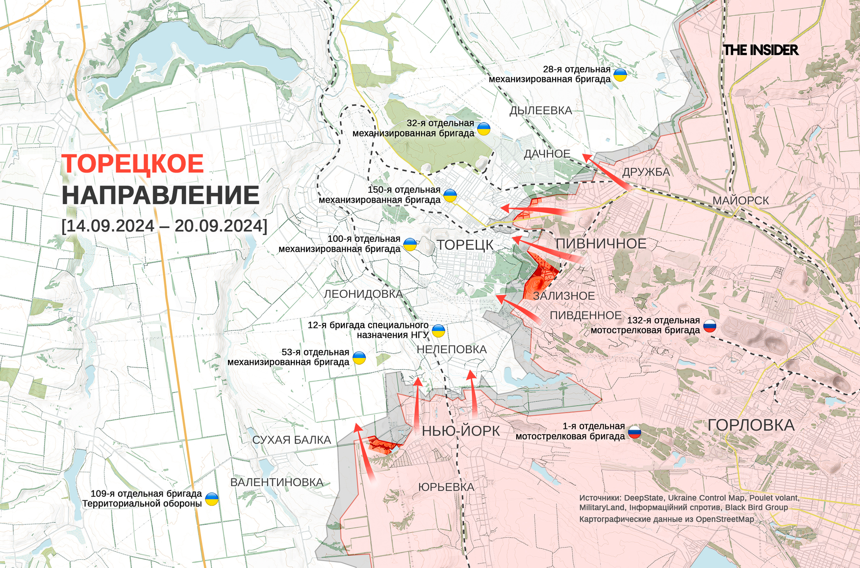 DeepState сообщает о продвижении ВС РФ рядом с Нью-Йорком (в 1951–2021 годах — Новгородское) и Торецком (до 2016 года — Дзержинск).