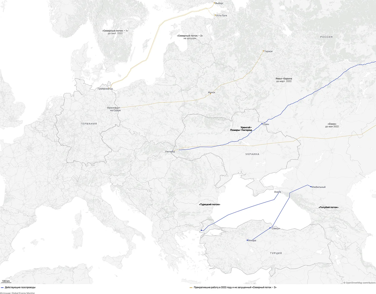 Поставки по «Северному потоку» тоже стали сокращаться. Летом 2022 года «Газпром» перекрывал газопровод на техобслуживание и профилактику, заявлял о поломках турбин на компрессорных станциях и невозможности отремонтировать их из-за санкций. В июле 2022 года трубопровод работал всего на 20% от потенциальной мощности, а в сентябре полностью прекратил прокачку: «Газпром» заявил, что из строя вышла последняя турбина. А через три недели на газопроводе произошла диверсия — взрывы разрушили обе нитки остановленного «Северного потока» и одну из двух ниток «Северного потока — 2», так и не введенного в эксплуатацию.