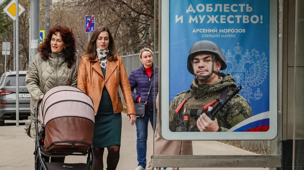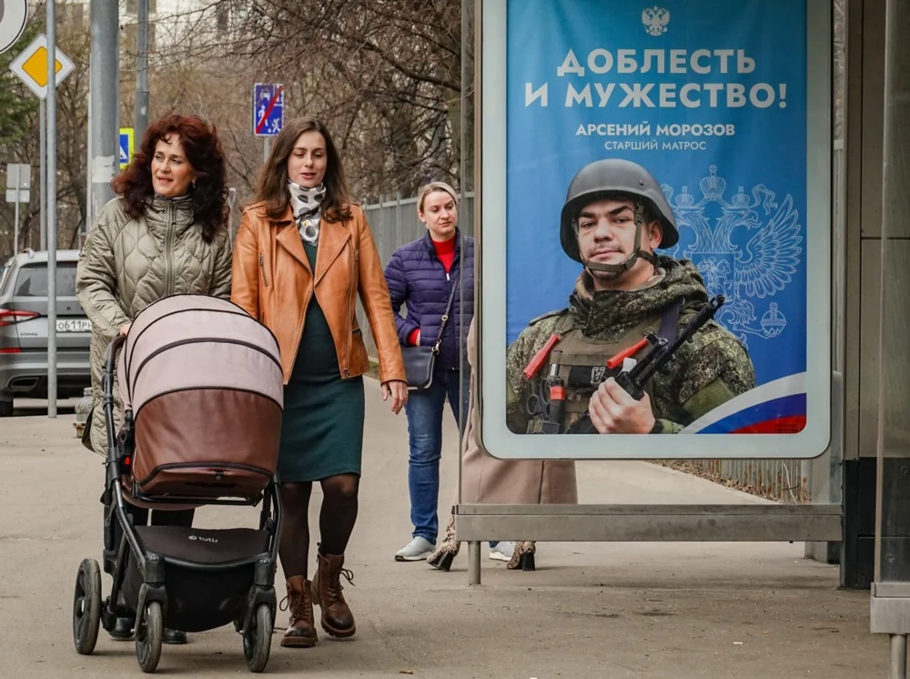 Women walk past an advertisement for military conscription in Moscow. Photo: EPA-EFE/YURI KOCHETKOV
