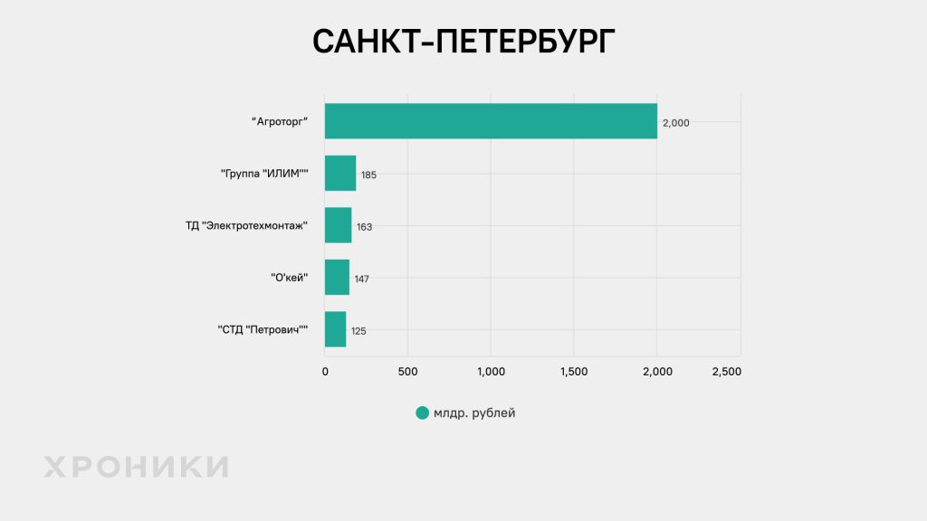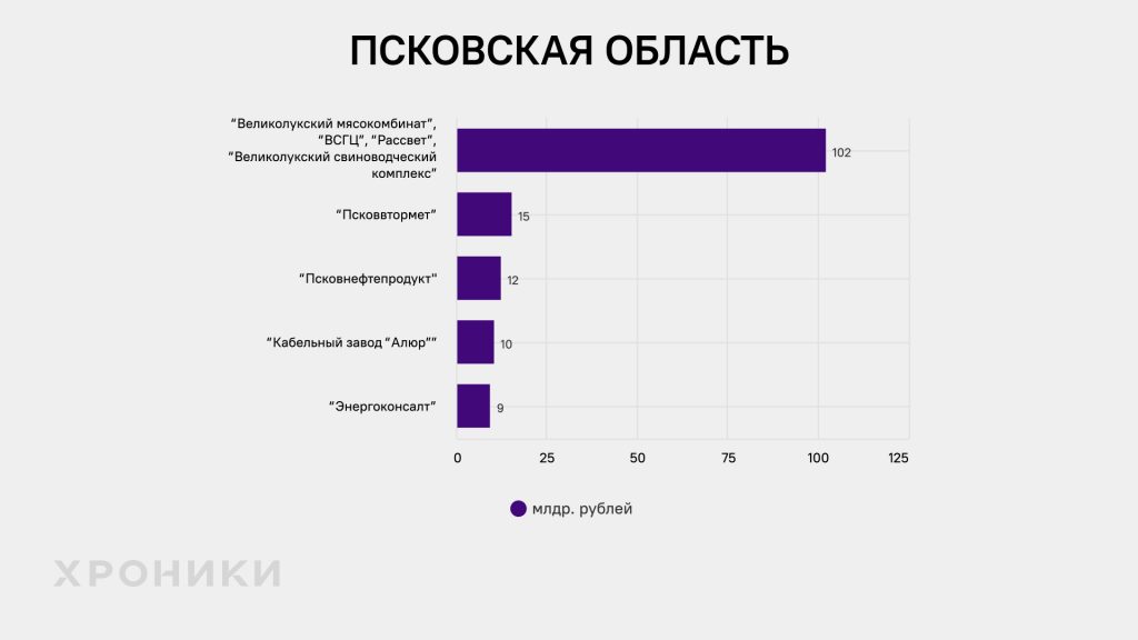 Первое место у «Великолукского мясокомбината» (47 млрд) и связанных с ним предприятий «ВСГЦ» (31 млрд), «Рассвет» (12 млрд) и «Великолукский свиноводческий комплекс» (12 млрд). Компания не раскрывает собственников, но СМИ называют главным акционером компании предпринимателя Владимира Подвального. Петербуржцам известна не только колбасы и сосиски комбината, но и парк атракционов «Диво Остров», который тоже принадлежит мясникам.