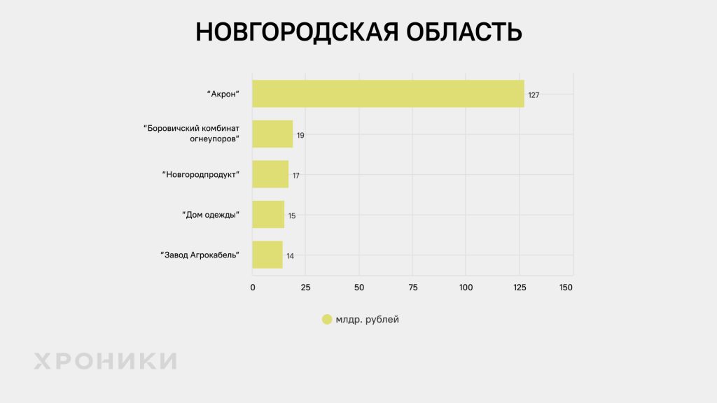 Первое место у производителя минеральных удобрений «Акрон» (127 млрд). Как и «Северо-Западная фосфорная компания» в Мурманской области, входит в бизнес-империю Вячеслава Кантора.