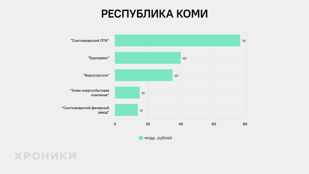На первом месте — «Сыктывкарский ЛПК» (76 млрд). Комбинат возник еще в СССР, а в начале XXI века прокуратура возбудили уголовное дело, заподозрив, что предприятие незаконно приватизировали, писала «Новая газета». Сначала тогдашний глава республики Юрий Спиридонов бесплатно передал подконтрольному фонду 15% акций комбината. Их продали австрийской фирме Frantschach AG за десять миллионов долларов, которые, как писали журналисты, растратили «на весьма сомнительные проекты». Другую, большую часть акций купила мультинациональная компания Mondi. В 2023 году после того, как Кремль решил вторгнуться в Украину, Mondi ушла из России, продав комбинат московскому девелоперу Sezar Group. Его бенефициар — предприниматель Исай Захаряев.