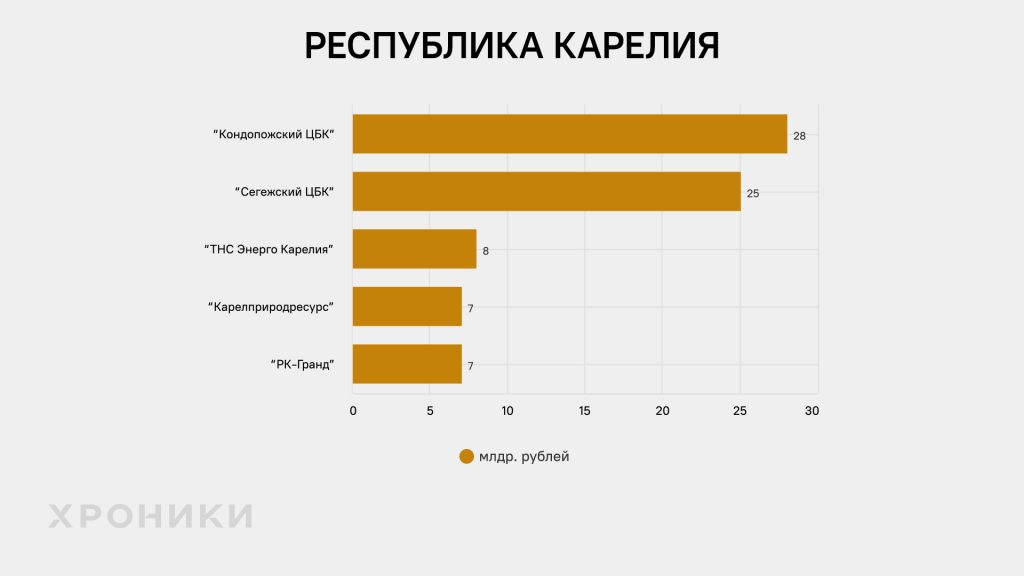 Первое место — «Кондопожский целлюлозно-бумажный комбинат» (28 млрд). Он входит в холдинг «Карелия Палп». Его основные акционеры — некие Олеся Бартошевич, Ирина Белик и Юлия Визельтер.