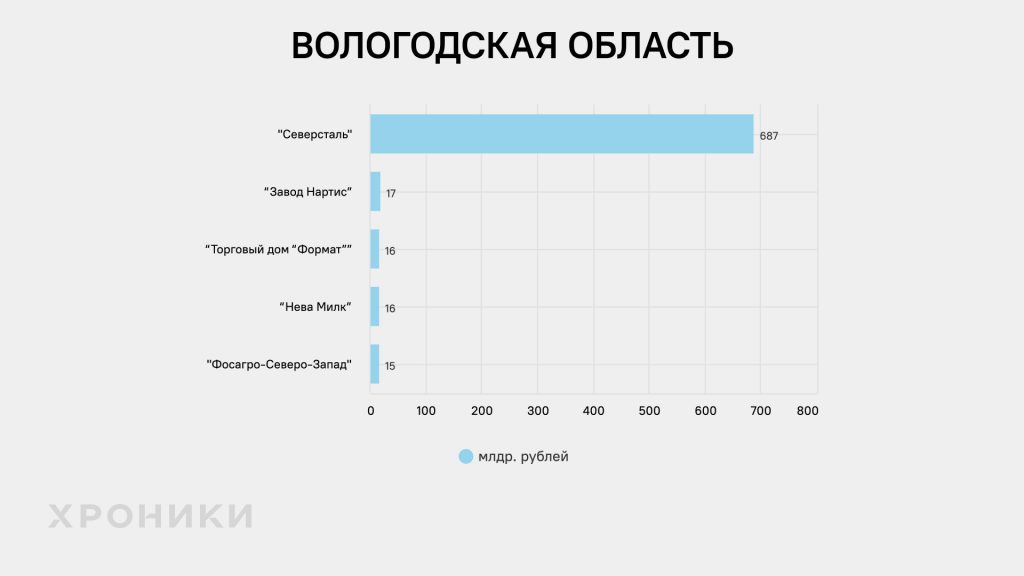 Первое место у «Северстали» предпринимателя Алексея Мордашова (687 млрд). Он фактически контролирует регион. «Хроники» писали, например, о связях компании с бывшим спикером областного парламента Андреем Луценко.