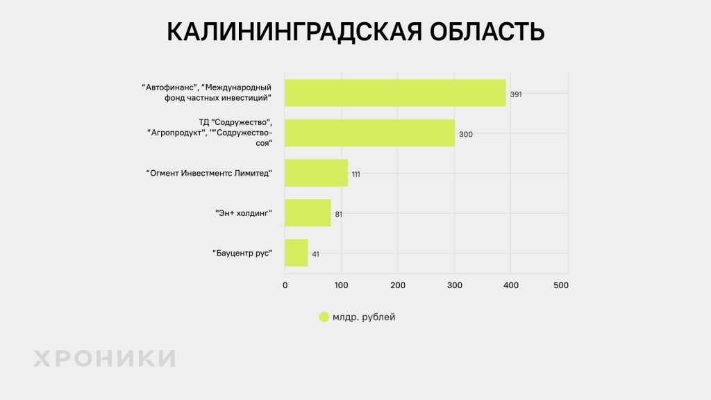 На первом месте — «Автофинанс» (258 млрд) и связанный с ним «Международный фонд частных инвестиций» (133 млрд). Первое юрлицо занимается различными сделками с автомобилями, второе — управляет холдинг-компаниям. Обеими компаниями владеет бывший зампред правительства СССР Владимир Щербаков.