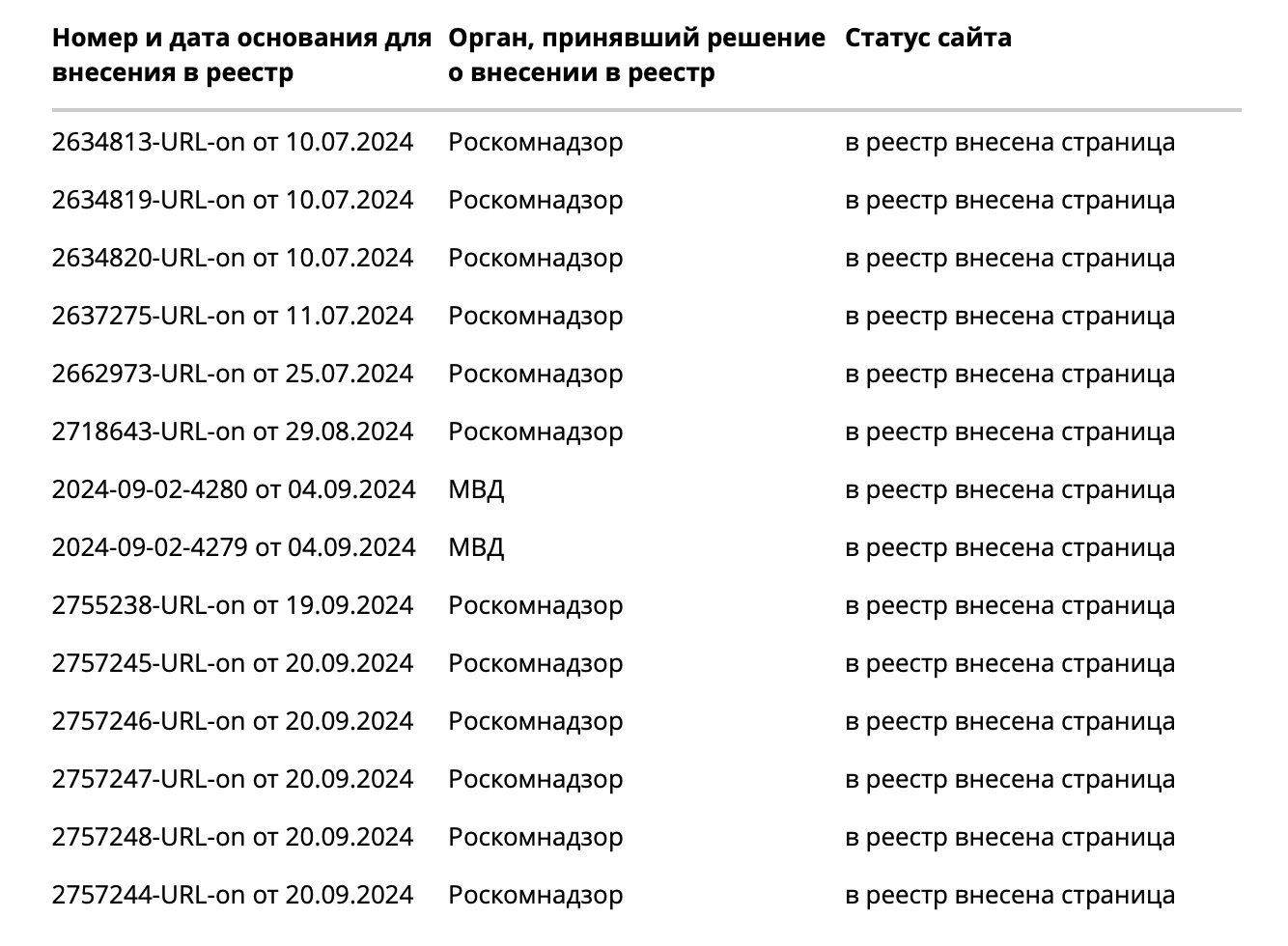 Скриншот из реестра запрещенных сайтов Роскомнадзора.