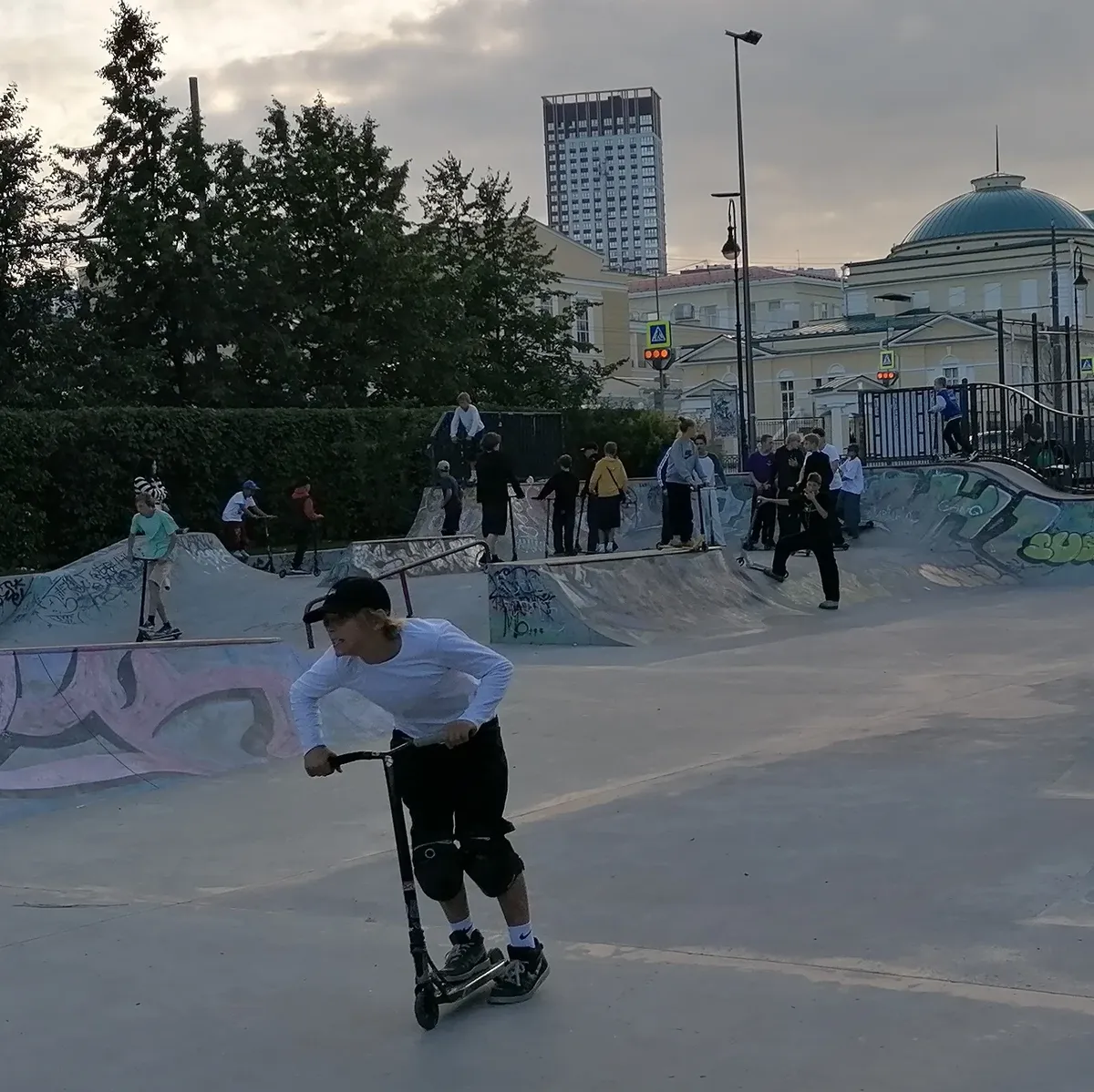 Перед Дворцом молодежи — площадь. Рядом — скейт-парк. И как ласточки небо — во всех направлениях бетон и гранит чертят дети. На скейтах — подростки и парни, на самокатах — начальная школа. Солнце уходит в перспективу ВИЗ-бульвара — он начинается к западу от скейт-парка, а поверх вечерней зари на всех выливается ветер.