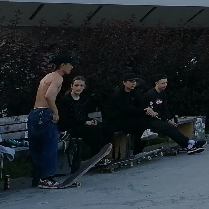Дети, как ласточки, катаются до упора, до сумерек и в них — почему-то только мальчики; как странно. А взрослые парни просто сидят на скамьях, идут мимо, все в черном. Самоуглубленные, потерянные, уверенные, всякие.