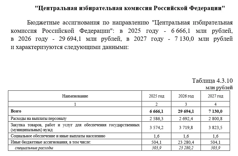 На деятельность ЦИК в 2026 году планируется выделить аномальное количество средств — почти 30 млрд рублей. Наибольший рост указан в статье «специальные расходы» — на них уйдет почти 23 млрд рублей. Чуть ниже таблицы указано, что в этом году 23 млрд уйдут на «реализацию государственных функций федеральных государственных органов». Что это значит — в документе не раскрывается. В 2026 году пройдут очередные выборы в Государственную Думу.