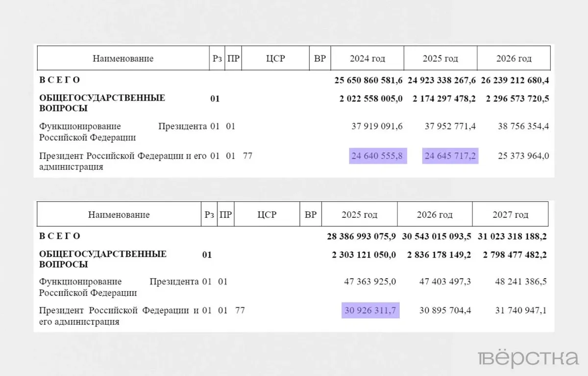 Как обратила внимание «Вёрстка», содержание Владимира Путина и его администрации в 2025 году обойдется почти в 31 млрд рублей, следует из опубликованного проекта бюджета.