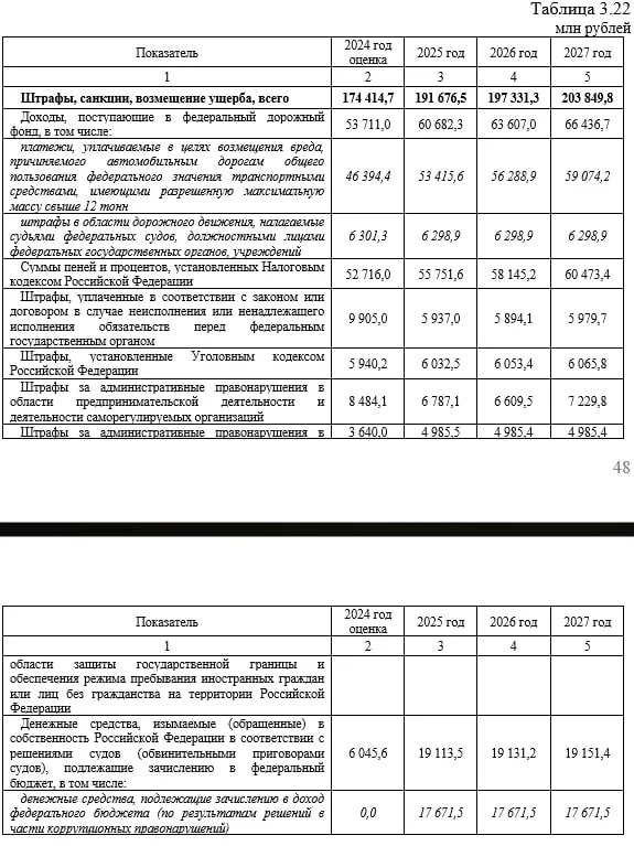 Вырастут и доходы от штрафов, санкций и возмещения ущерба — со 174,4 млрд рублей до 191,7 млрд рублей в 2025 году. Штрафы за нарушение преступлений, описанных УК, при этом практически не изменятся, зато многократно вырастут поступления от изъятия денег по судам (с 6 млрд до 19,1 млрд — рост в 3,2 раза).