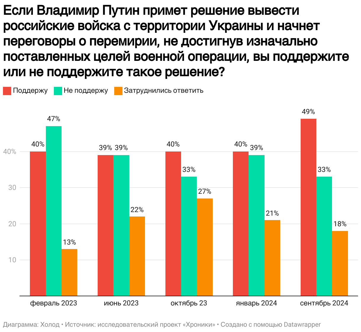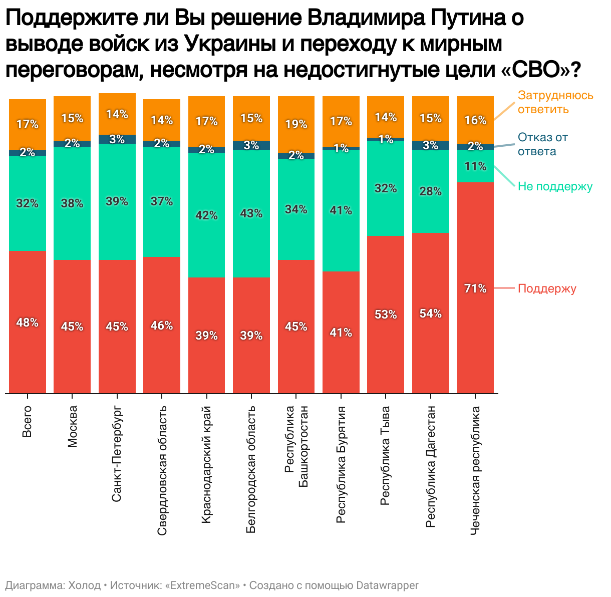Похожая ситуация наблюдается с поддержкой возможного решения Владимира Путина о выводе войск из Украины. В лидерах снова этнические республики: Чечня (71%), Дагестан (54%) и Тыва (53%). Несколько ниже уровень поддержки в Башкортостане (45%) и Бурятии (41%), однако в этих регионах и выше доля респондентов, которые ушли от прямого ответа.