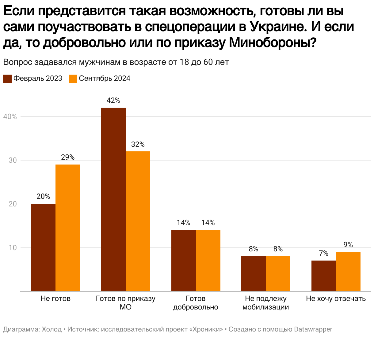 Доля россиян, которые готовы отправиться на войну добровольно, остается стабильной. Согласно данным опроса проекта «Хроники», в сентябре 2024 года 14% россиян заявили о готовности добровольно заключить контракт с Минобороны. В феврале 2023 года их доля была той же — 14%, а вот количество россиян, которые оказались не готовы заключать контракт в принципе значительно выросла: с 20% в феврале 2023 года до 29% в сентябре 2024-го. Параллельно снижается доля тех россиян, которые готовы отправиться на войну по приказу Минобороны: если в феврале 2023 года таких было 42%, то теперь — только 32%.
