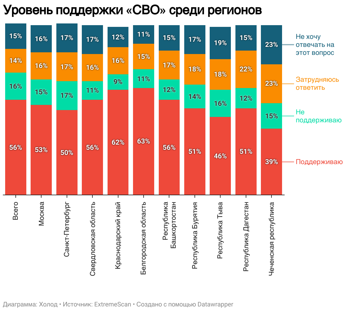 Некоторые регионы, согласно исследованию ExtremeScan, выступают за завершение войны даже сильнее, чем традиционные протестные центры — Москва и Санкт-Петербург. Среди исследуемых регионов самая низкая поддержка «СВО» зафиксирована в Чеченской республике — только 39% респондентов заявили о своей поддержке «спецоперации», на втором месте — Республика Тыва (46% поддержки), чуть выше уровень поддержки в Санкт-Петербурге — 50%. В этих же регионах наибольшее число респондентов ушли от ответа на вопрос: либо затруднились дать точное суждение, либо просто отказались отвечать на вопрос, что может свидетельствовать о том, что уровень поддержки «СВО» в этих регионах еще ниже.