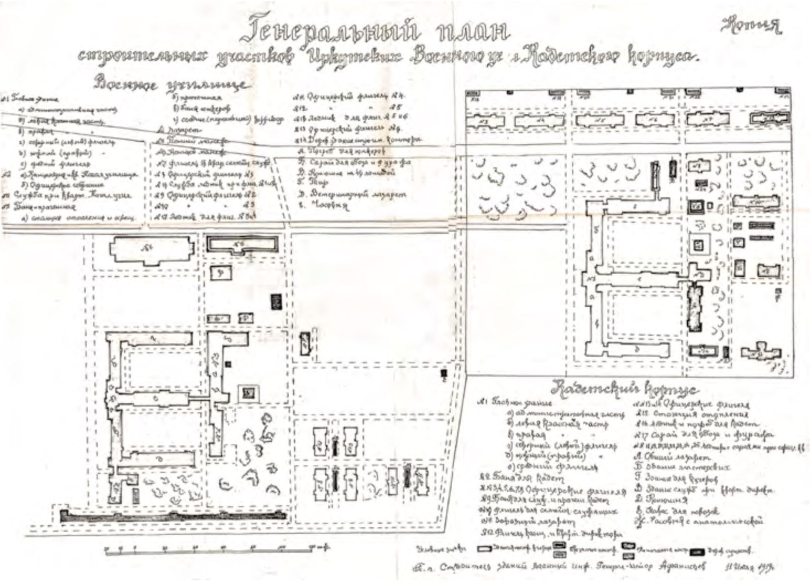 Военный городок в Иркутске начали строить в 1915 году для размещения двух учреждений – Военного училища и Кадетского корпуса. Главные здания учреждений построили почти по идентичным проектам. Фасады были оформлены почти одинаково – в них использовали одни и те же элементы и композиционные построения. Заметно отличался лишь центральный портик.