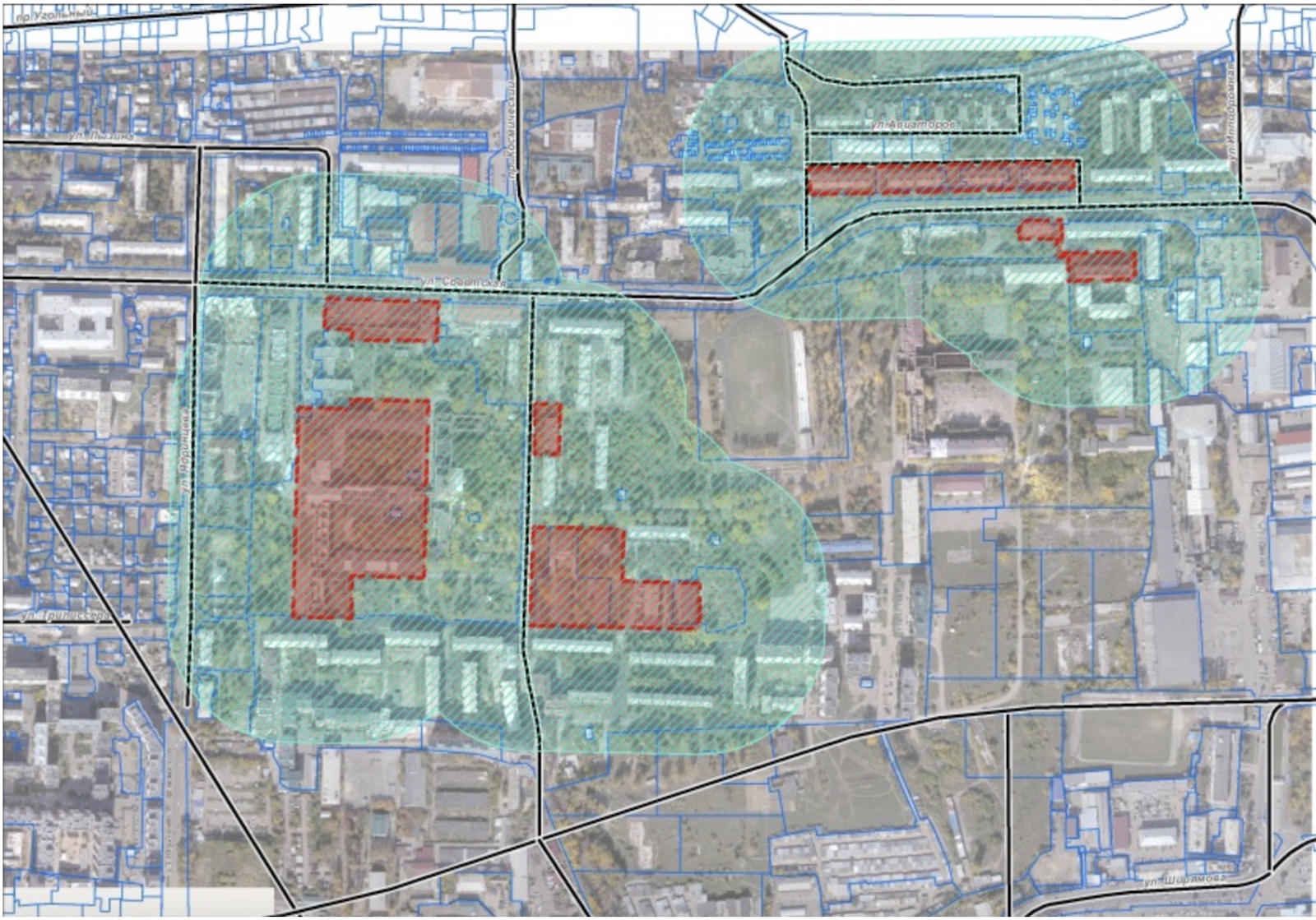 На современных градостроительных схемах видно, что кадетский корпус (казармы) уже выведены из ансамбля и своего буфера не имеют.