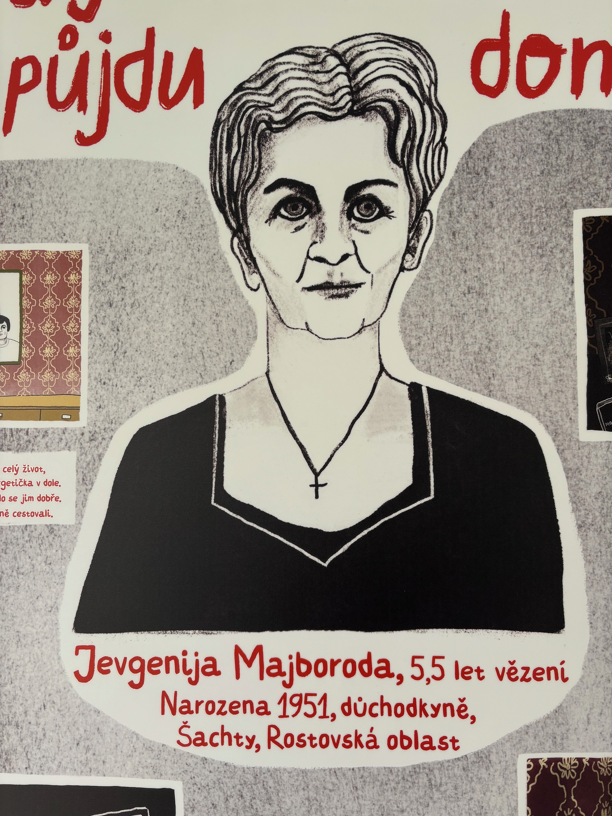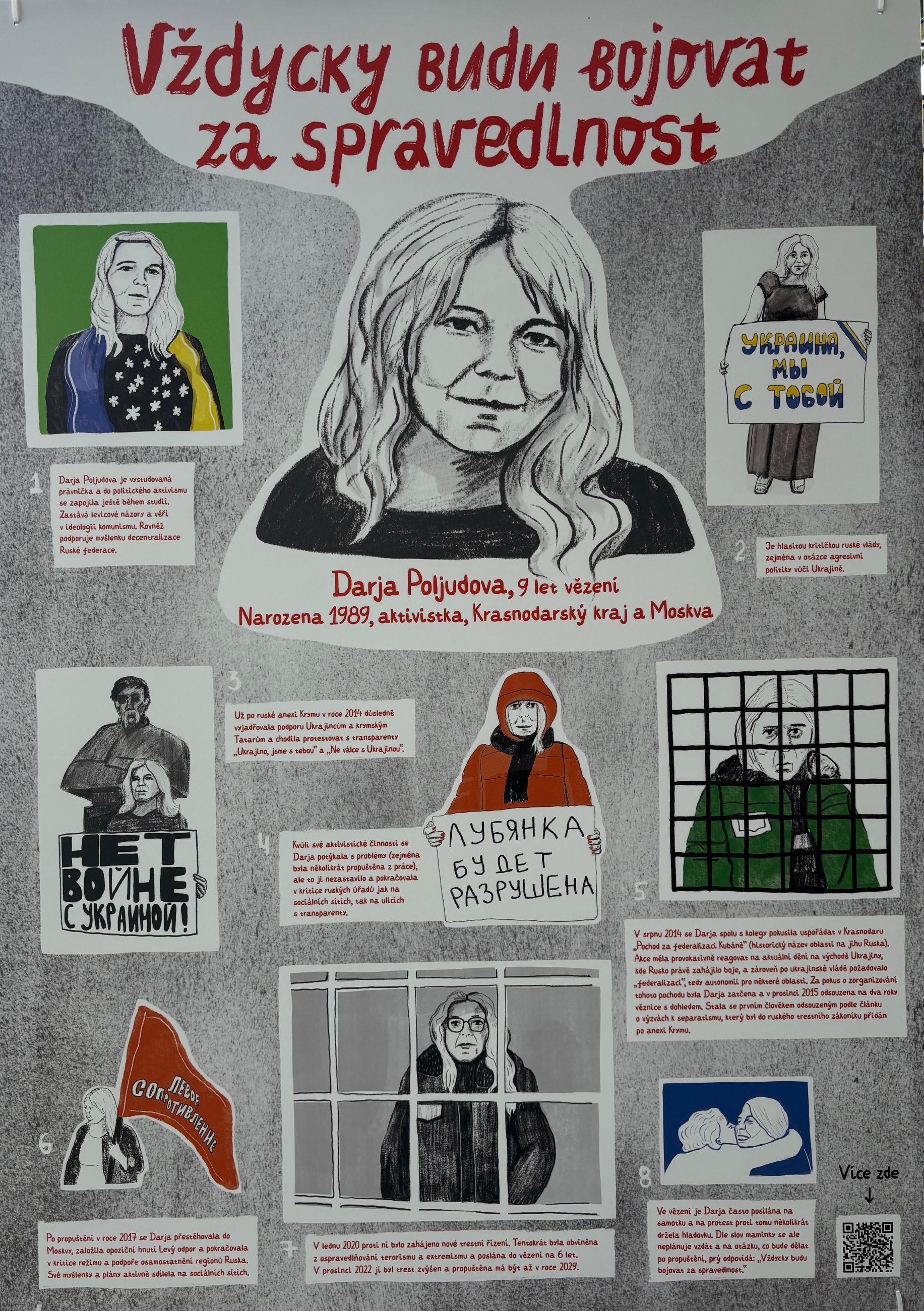 Помимо Олега Орлова среди рассказанных историй российского протеста и репрессивной реакции на него упоминается еще один сотрудник "Мемориала", историк Юрий Дмитриев, который продолжает находиться в заключении. Рядом с ними имена не такие известные – Алексея Нуриева и Романа Насрыева – молодых людей из Челябинской области, которые попытались поджечь военкомат. Один из выставочным стендов рассказывает об Алексее Москалеве и его дочери, нарисовавшей антивоенный рисунок. "Когда мы готовили выставку, то поняли, что хотим рассказать эту историю, потому что она ярко демонстрирует жестокость современной России – это преследование не только против отца, что само по себе ужасно, но и против его 13-летней дочери, что абсолютно чудовищно. Также мы включили истории журналистов, пострадавших за то, что они продолжают работать в России", – говорит Александра Скорвид, сотрудница чешского отделения правозащитного центра "Мемориал". По ее словам, идея выставки родилась из желания привлечь внимание к проблеме политических заключенных в России и при этом рассказать как о сопротивлении тех, кого многие знают, так истории совсем неизвестные, а также показать, что география протеста – это вся Россия.