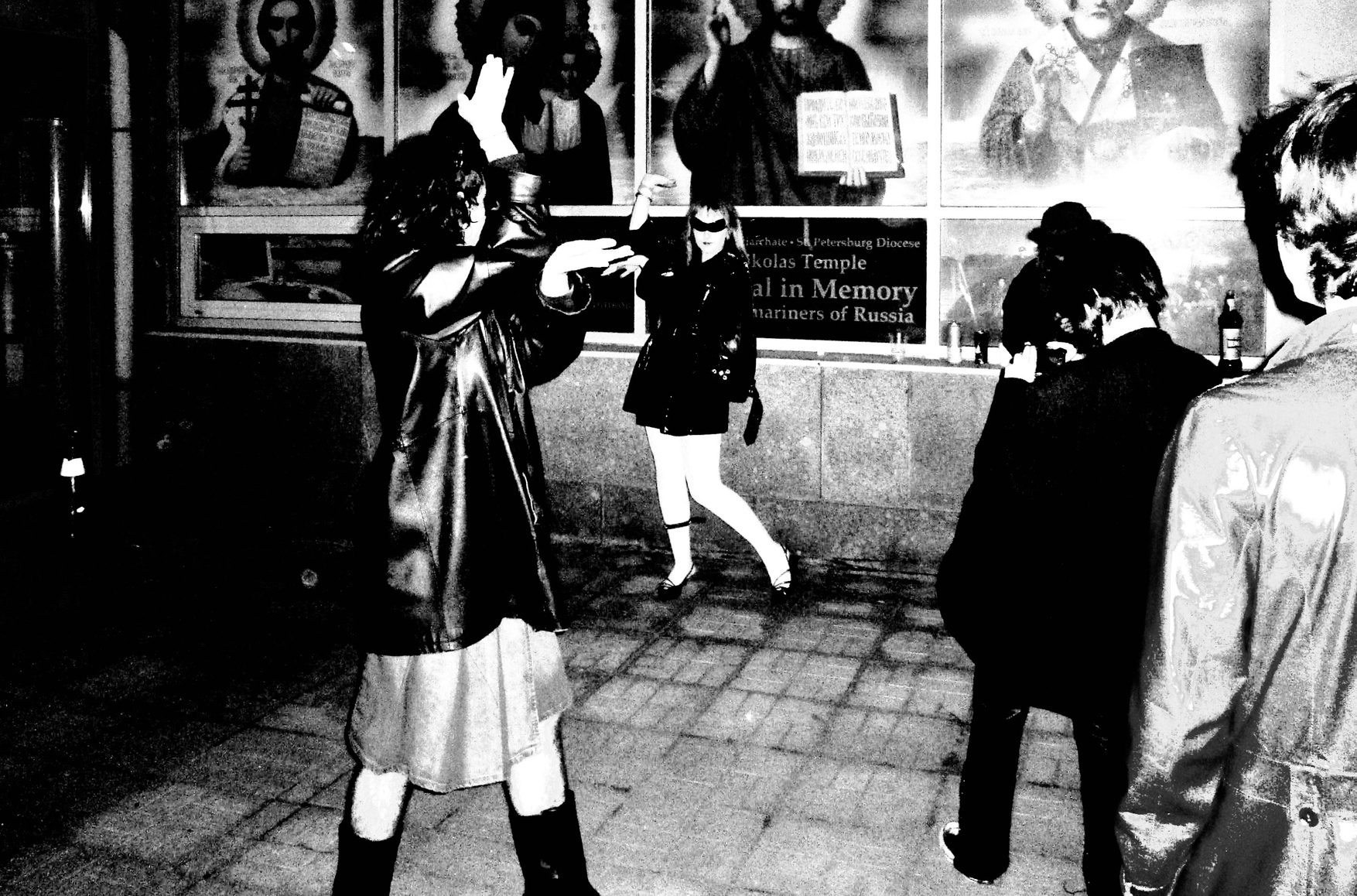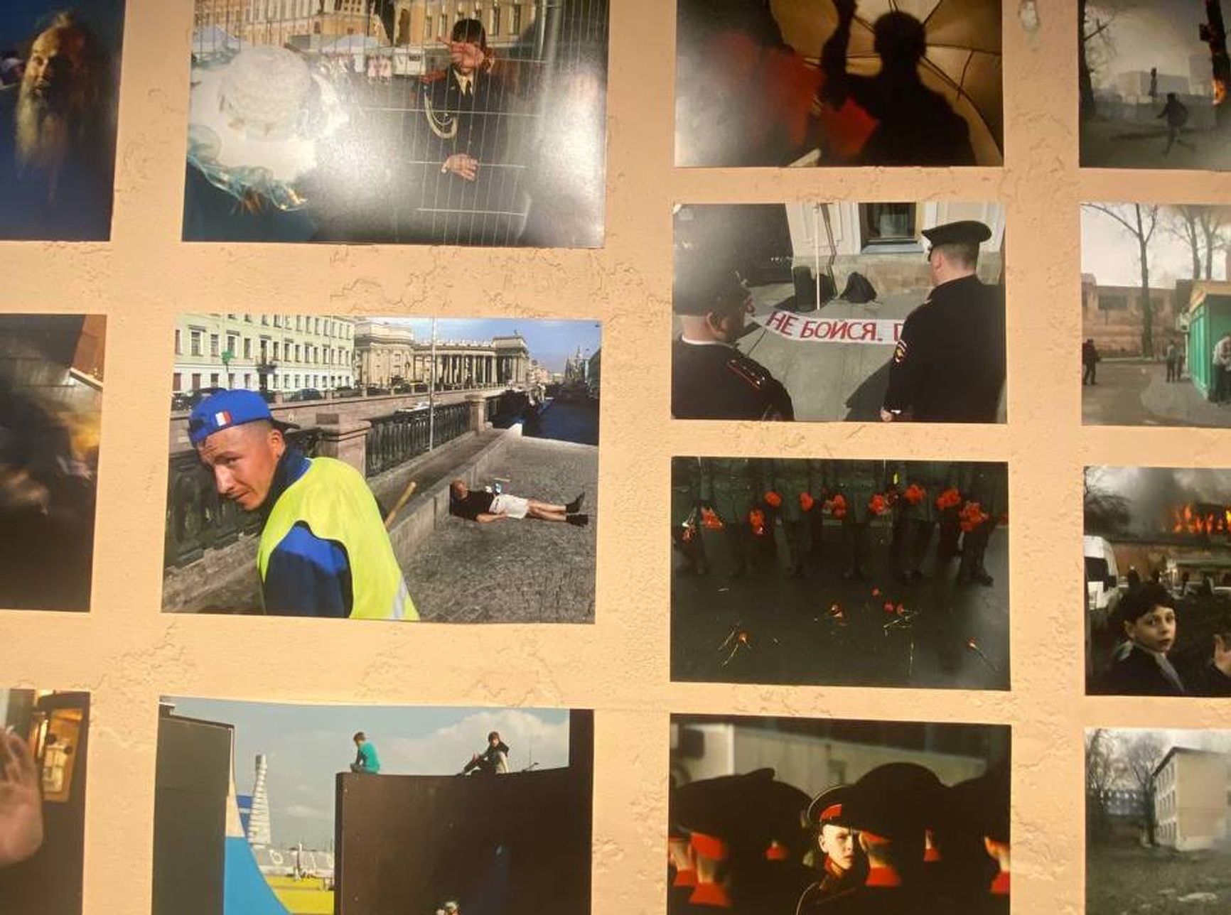 Одна из выставок, которые рекомендовал художник, — «Без движения». Это презентация коллекции стрит-фотографа, который много лет снимает Петербург. Мероприятие проходило в фотолаборатории за магазином с пленкой. Небольшие снимки были наклеены на стены, без рамок и дополнительного оформления. На них — знаменитая Думская улица, где подвыпившие тусовщики залезают на крыши автомобилей, пьяные военные на городских праздниках, бездомные и мигранты-уборщики, ленинградские бабушки в пальто кислотных цветов.